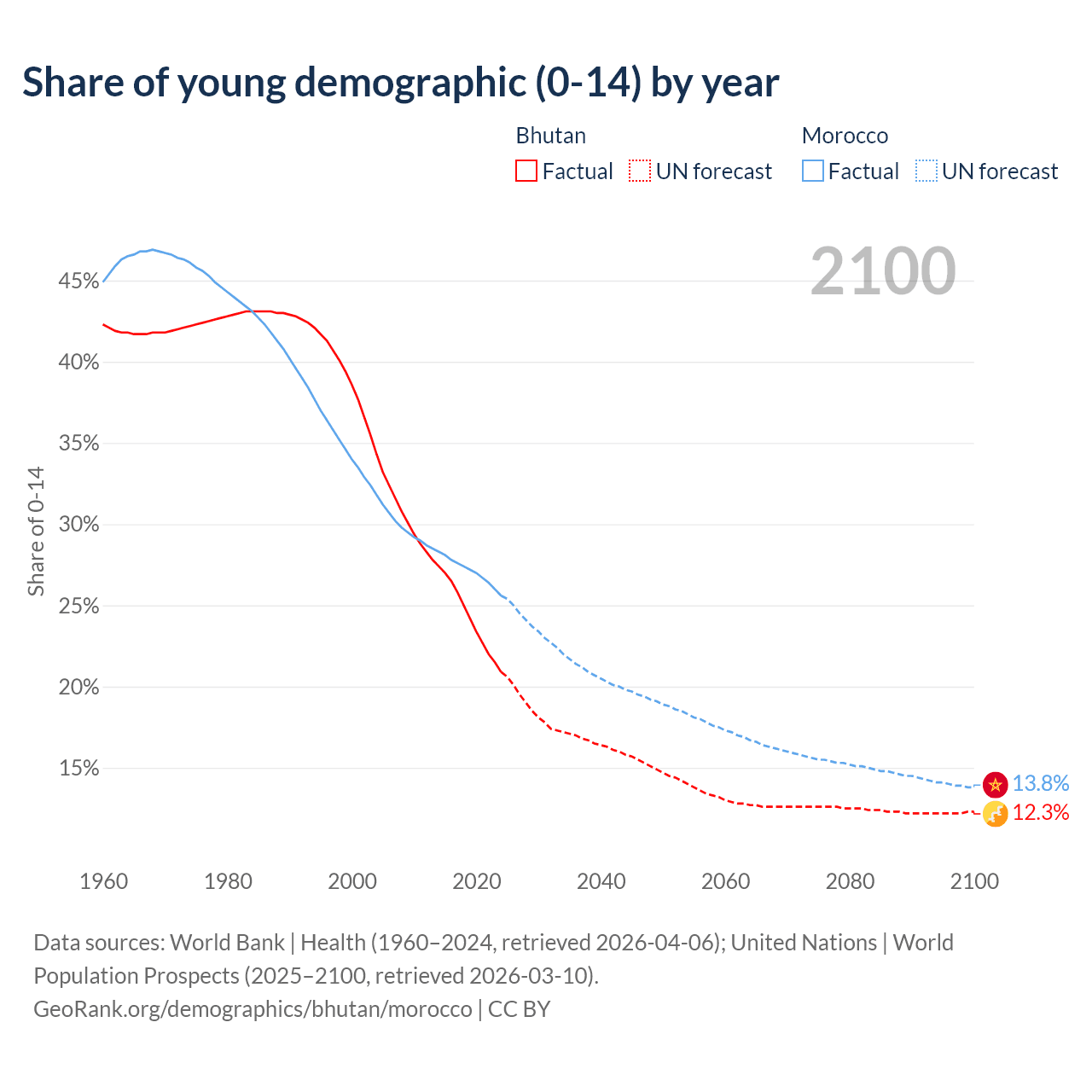 - The share of young demographic (0-15 years old) in Bhutan is 20.9% vs 25.6% in Morocco.