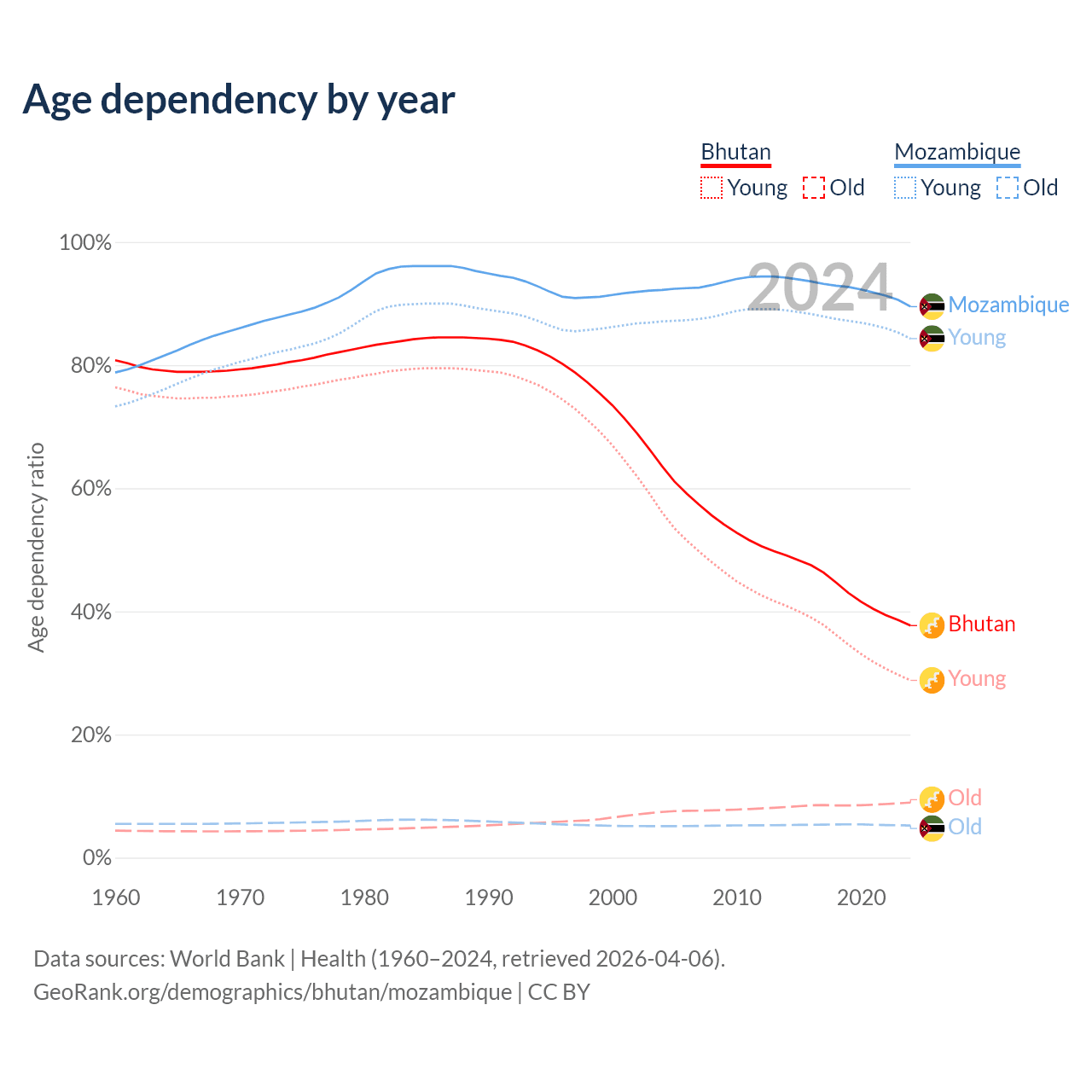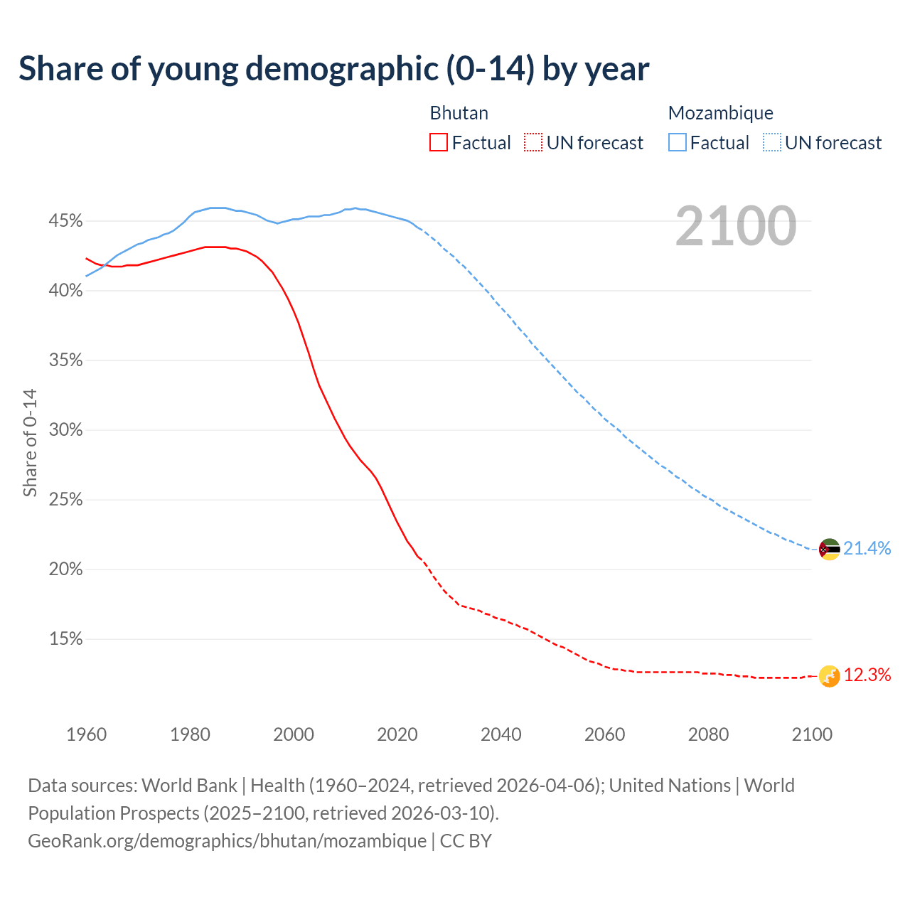 - The share of young demographic (0-15 years old) in Bhutan is 20.9% vs 44.5% in Mozambique.