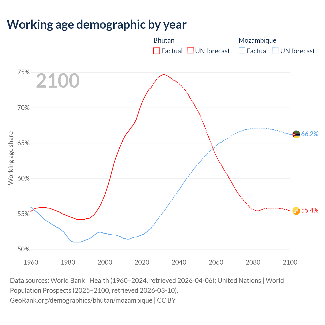 Median age Bhutan vs Mozambique, 1960-2100
