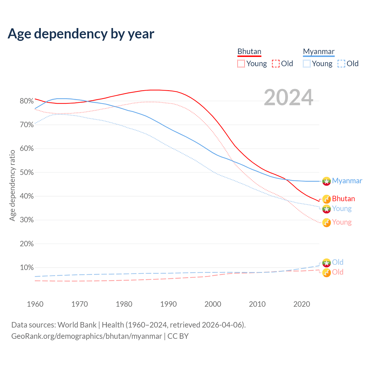 Data sources: World Bank | Health (1960–2024, retrieved 2026-04-06); U.S. Census Bureau (1960–2024, retrieved 2026-02-08).
