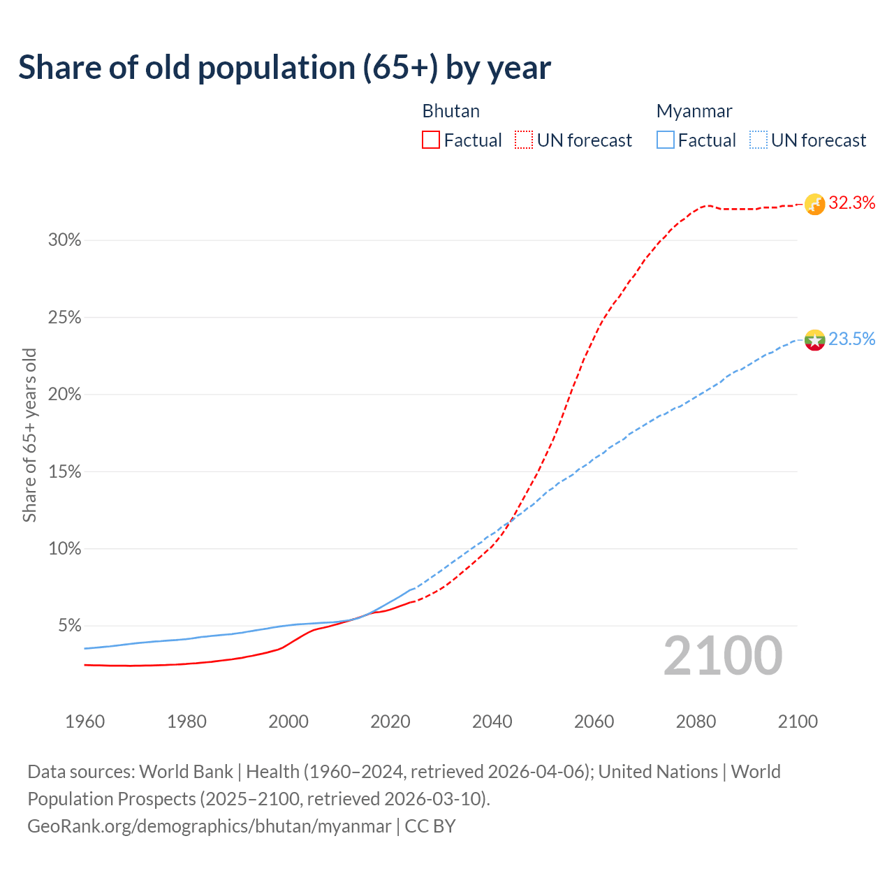 - The share of old-age demographic (65+) in Bhutan is 6.49% vs 7.3% in Myanmar.