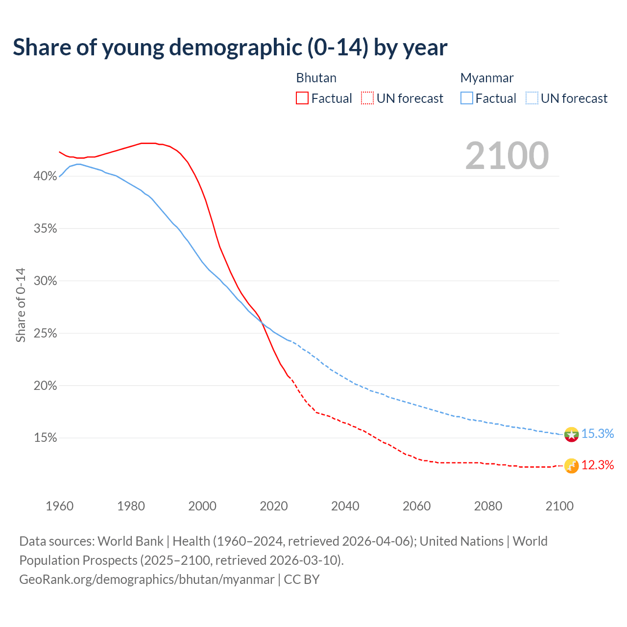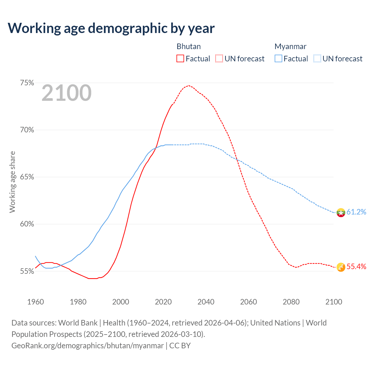 Median age Bhutan vs Myanmar, 1960-2100