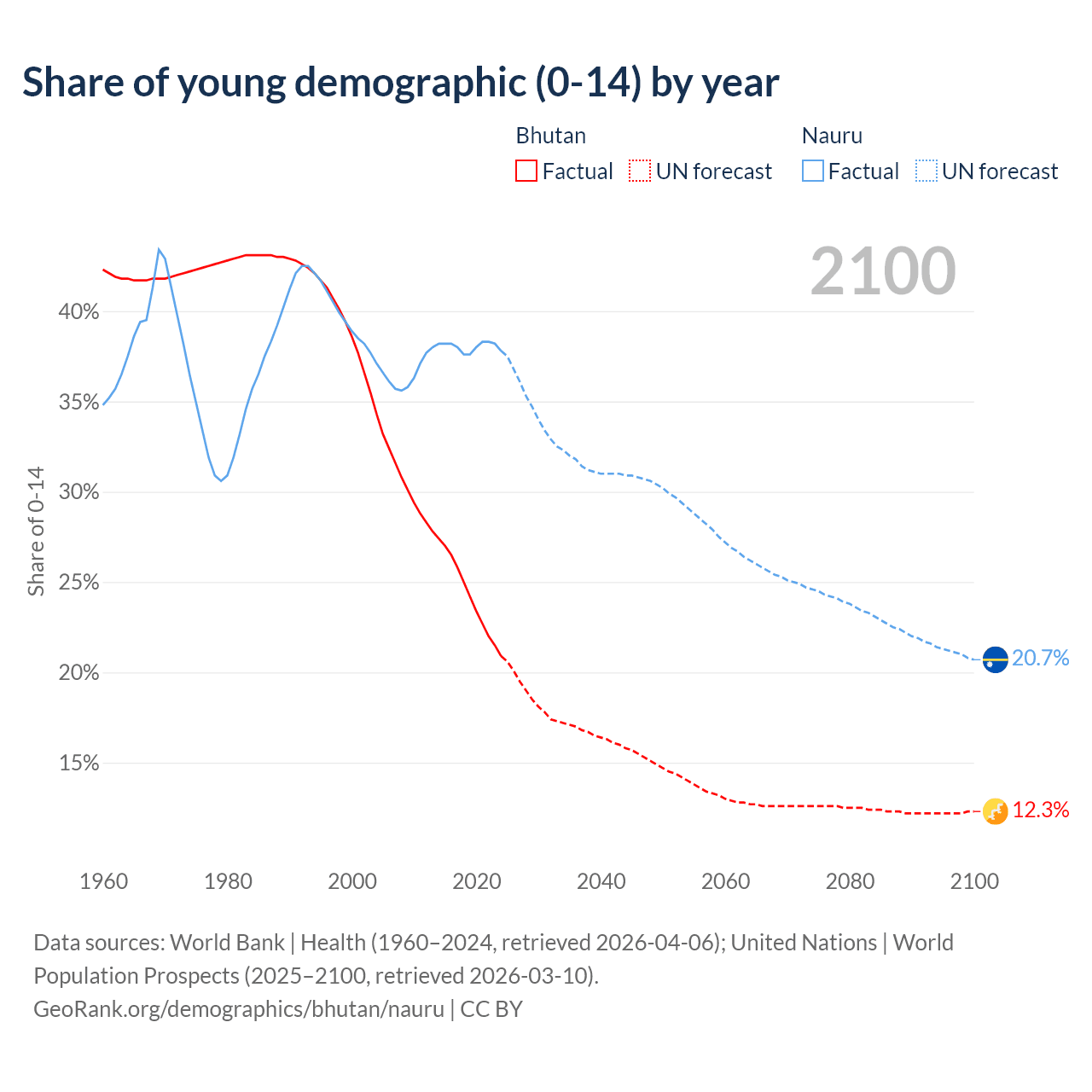 Median age Bhutan vs Nauru, 1960-2100