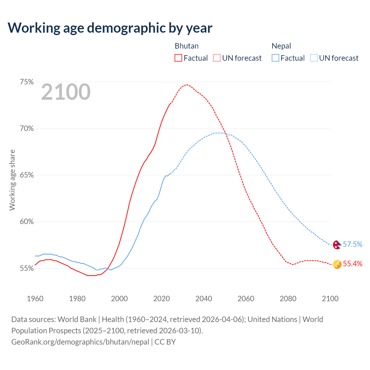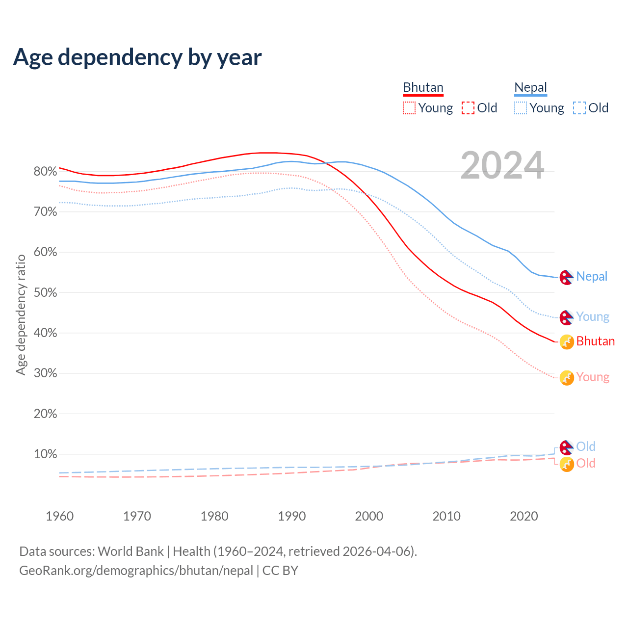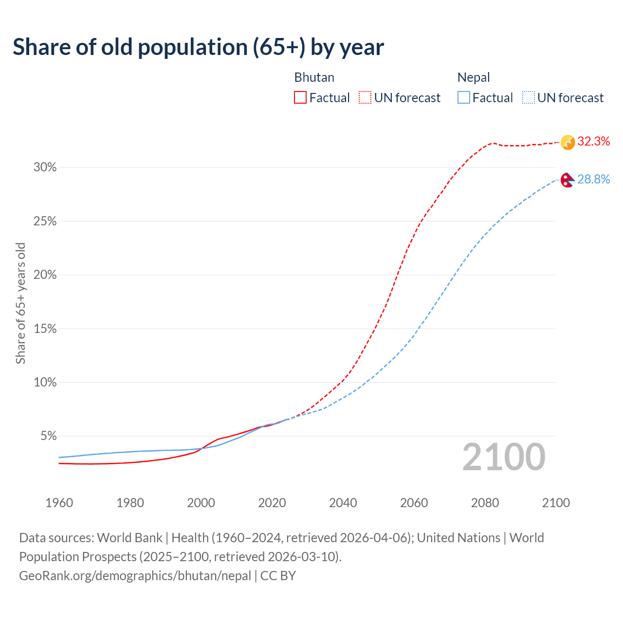 - The share of old-age demographic (65+) in Bhutan is 6.49% vs 6.5% in Nepal.