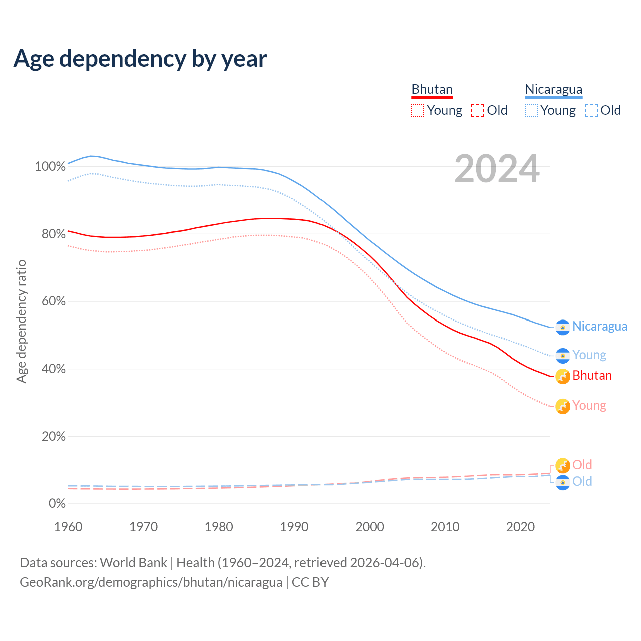 - The share of old-age demographic (65+) in Bhutan is 6.49% vs 5.53% in Nicaragua.