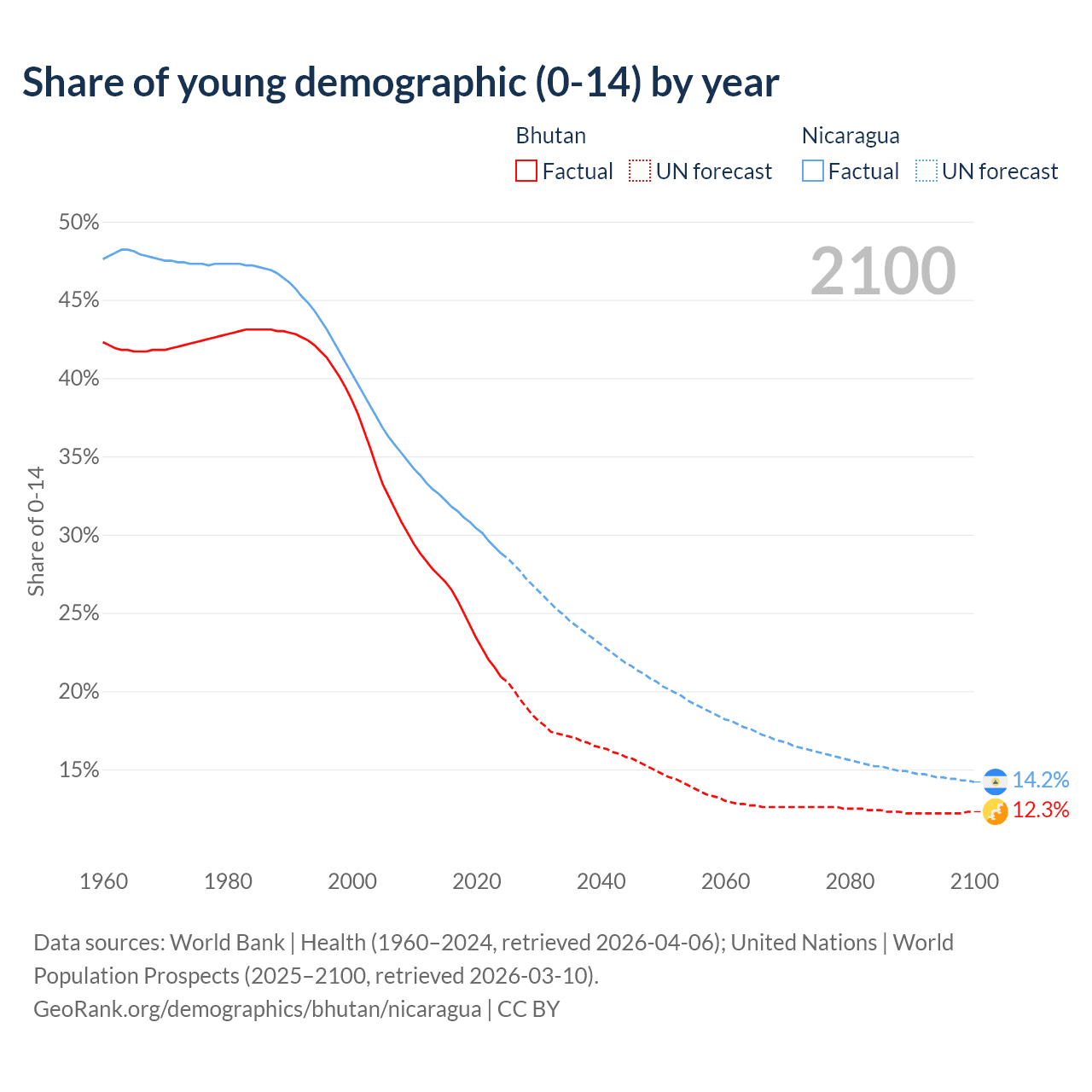 - The share of young demographic (0-15 years old) in Bhutan is 20.9% vs 28.8% in Nicaragua.