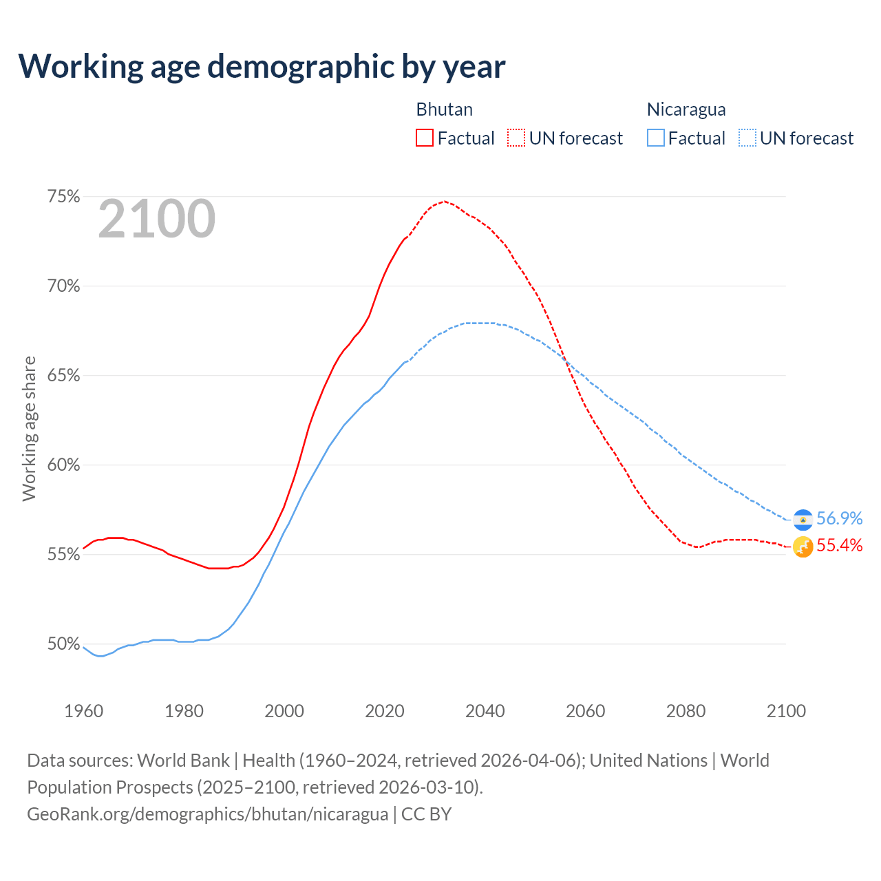 - Bhutan has 583K working age adults (aged 15-64) vs 4.68M in Nicaragua.