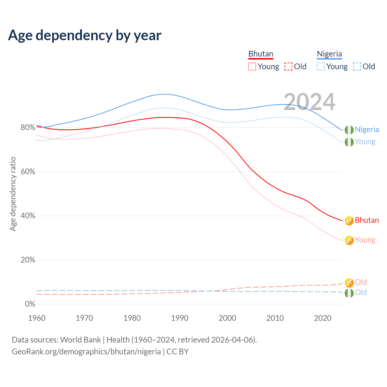 Data sources: World Bank | Health (1960–2024, retrieved 2026-04-06); U.S. Census Bureau (1960–2024, retrieved 2026-02-08).