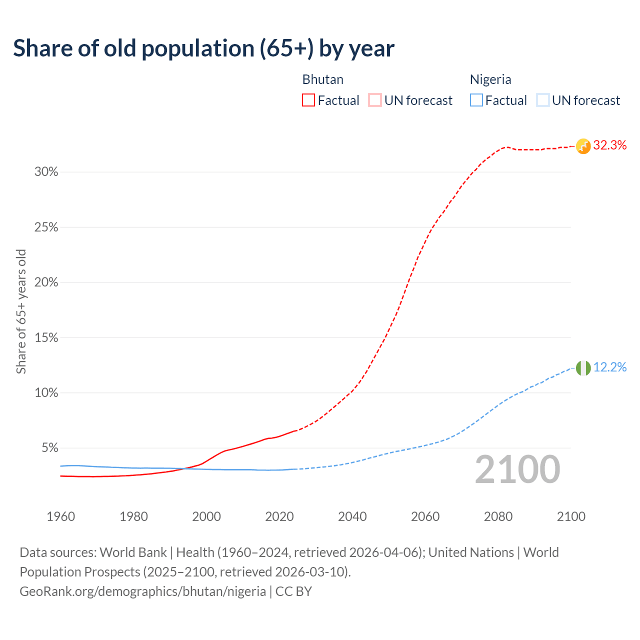 - The share of old-age demographic (65+) in Bhutan is 6.49% vs 3.05% in Nigeria.