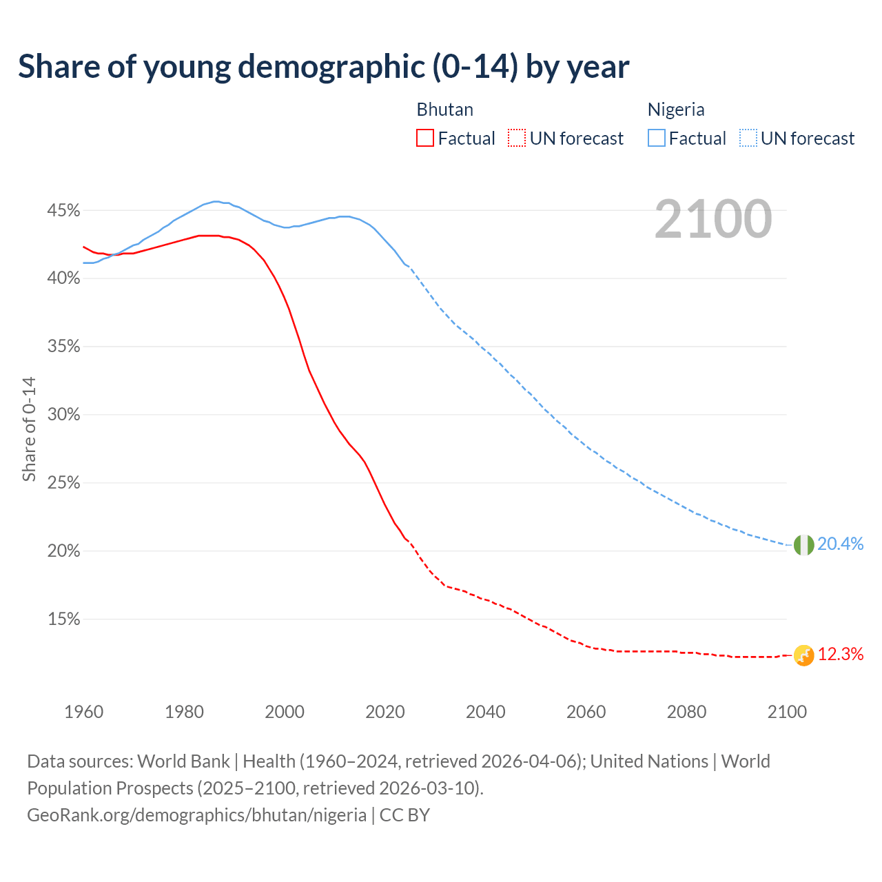 - The share of young demographic (0-15 years old) in Bhutan is 20.9% vs 41% in Nigeria.