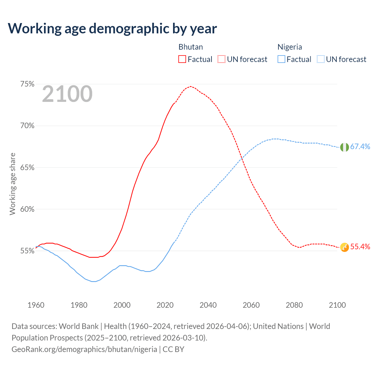 Median age Bhutan vs Nigeria, 1960-2100