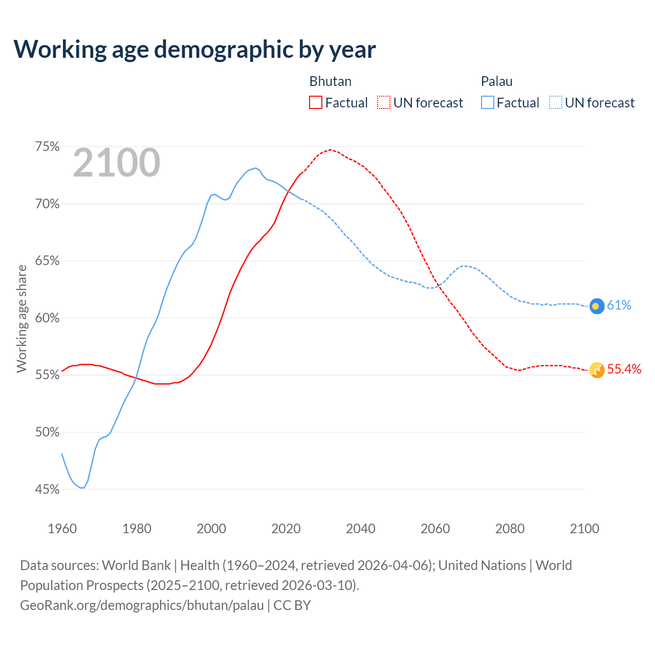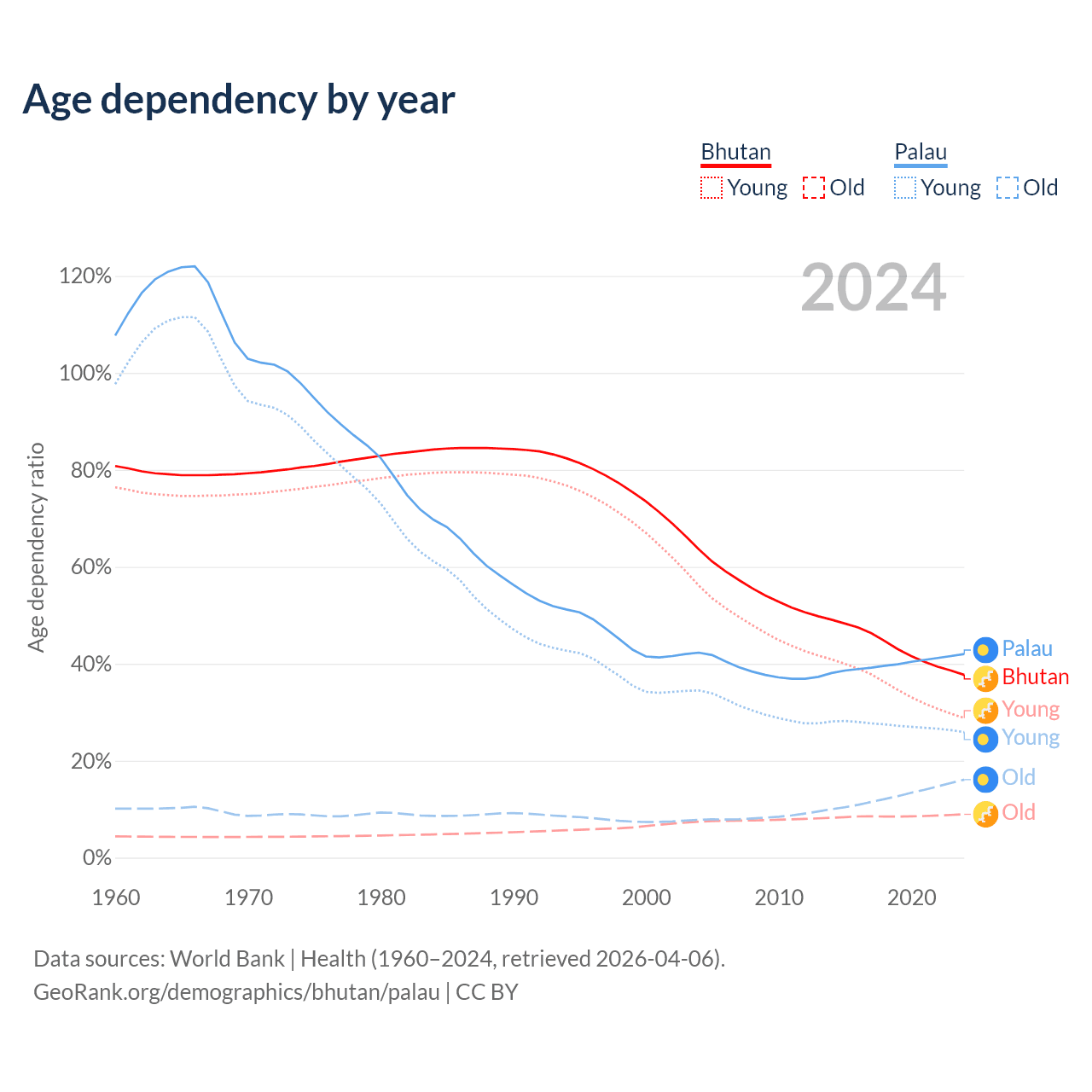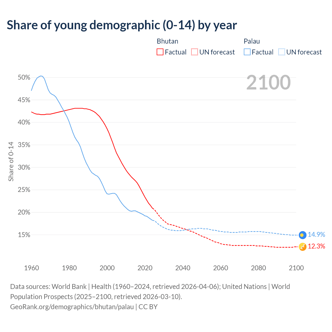 - The share of young demographic (0-15 years old) in Bhutan is 20.9% vs 18.2% in Palau.