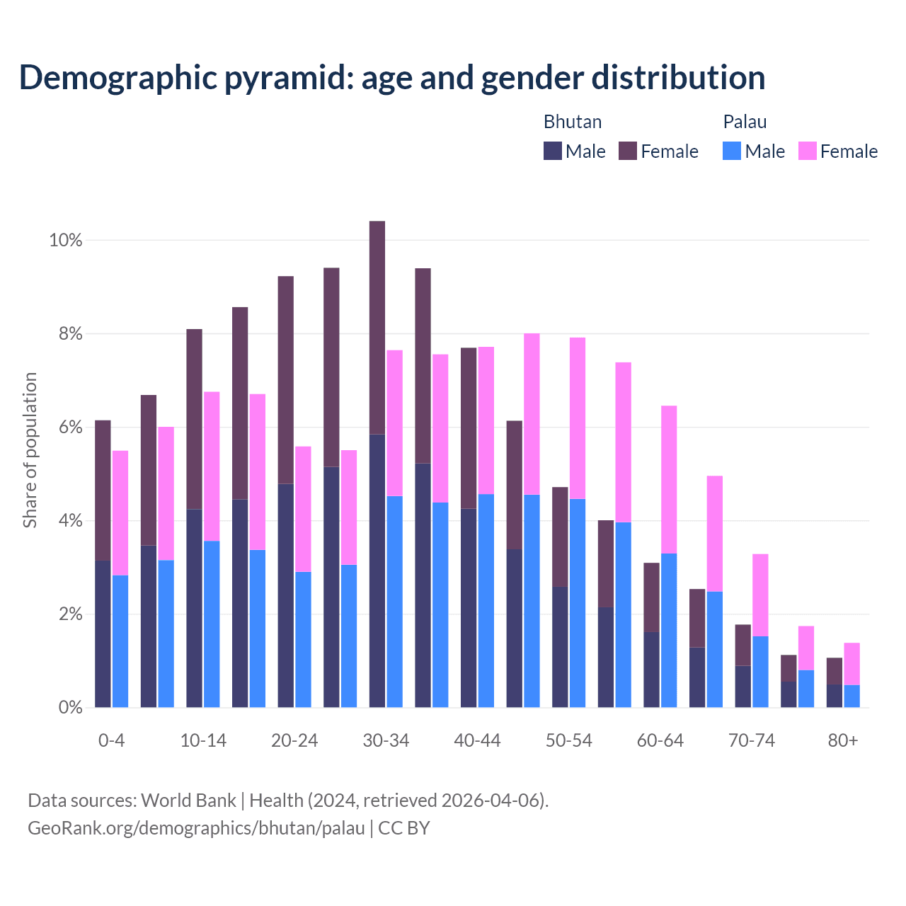 - Bhutan is ranked 95/196 by median age (oldest to youngest) vs 53/196 for Palau.