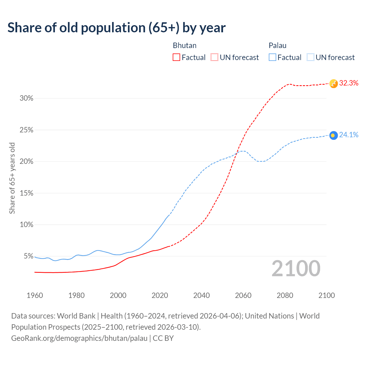- The share of old-age demographic (65+) in Bhutan is 6.49% vs 11.3% in Palau.