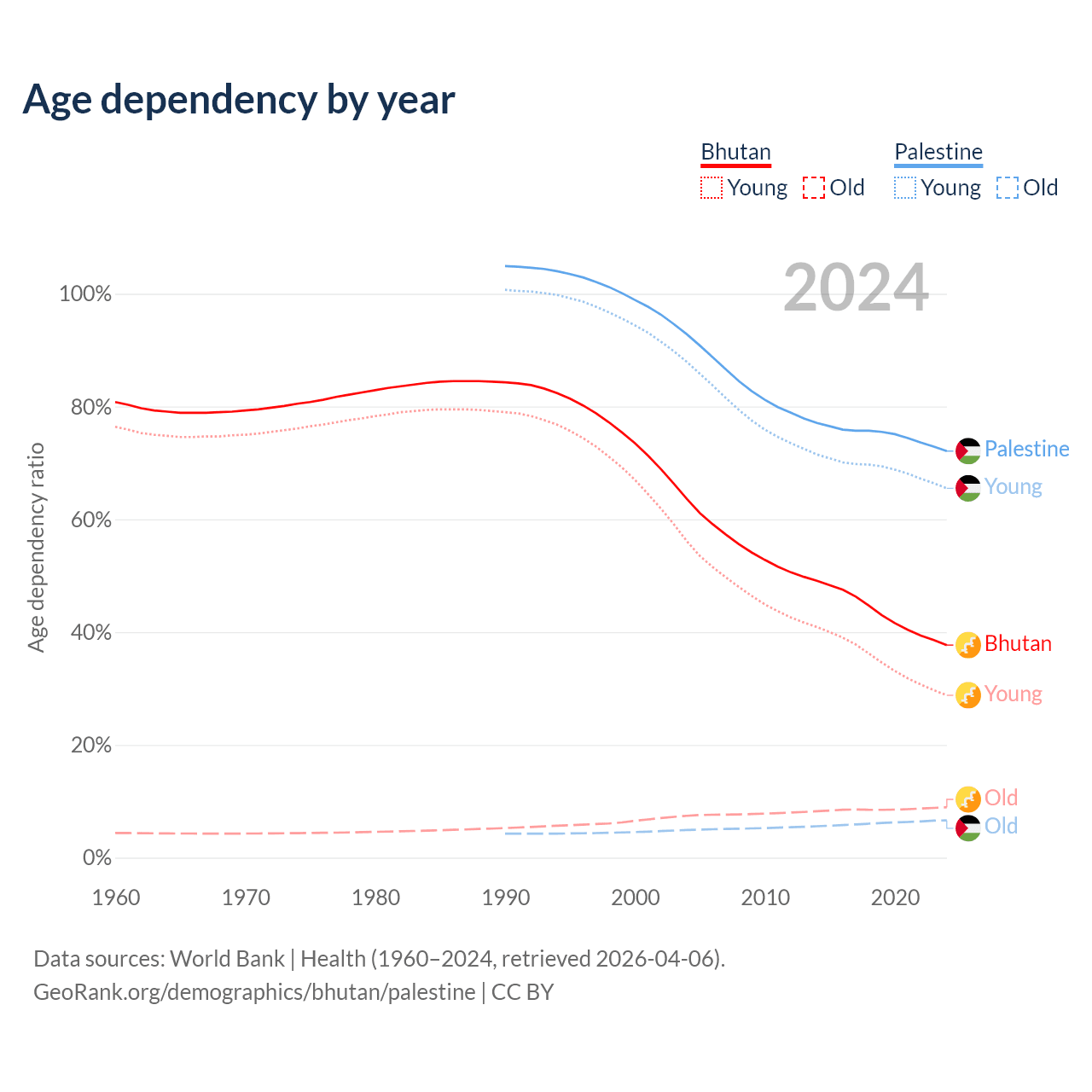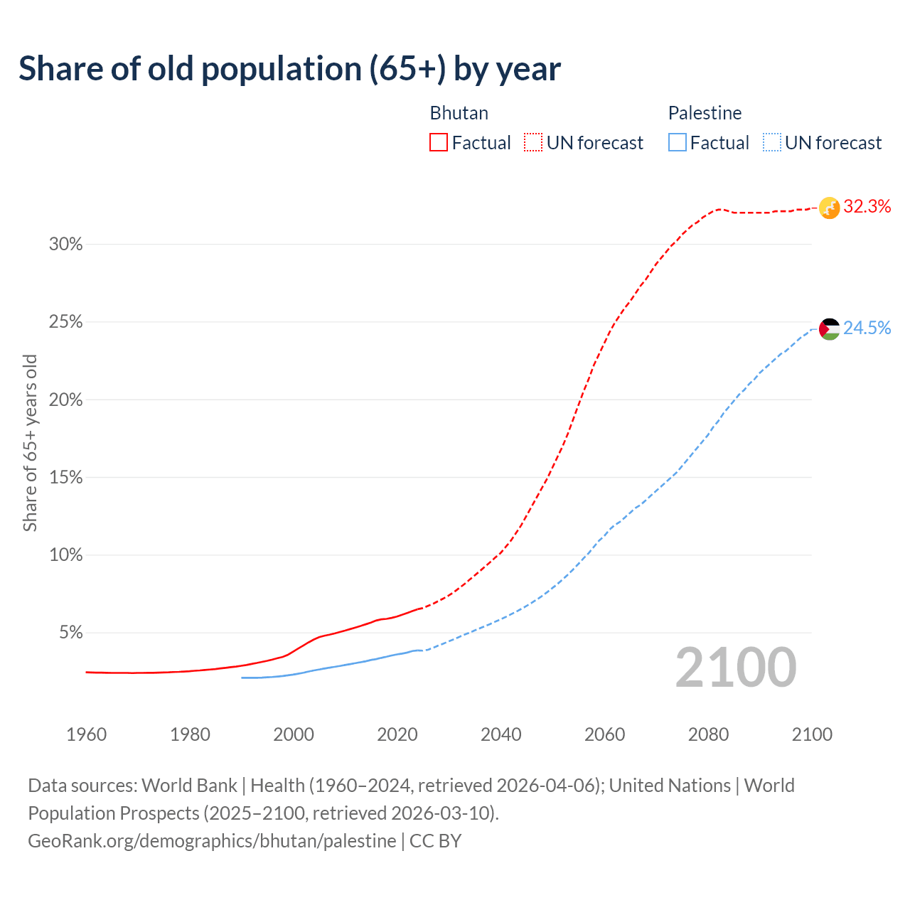 - The share of old-age demographic (65+) in Bhutan is 6.49% vs 3.84% in Palestine.