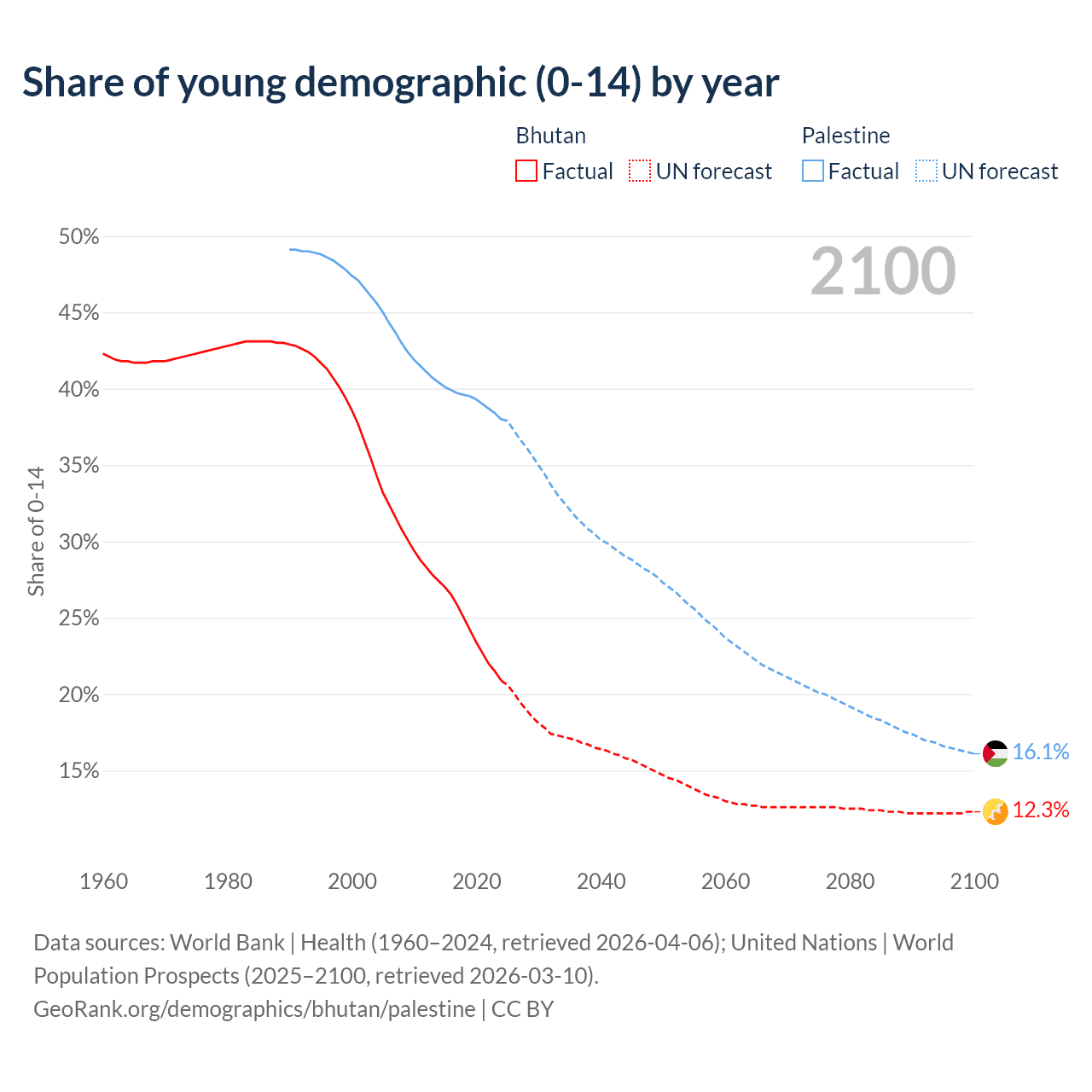 - The share of young demographic (0-15 years old) in Bhutan is 20.9% vs 38% in Palestine.