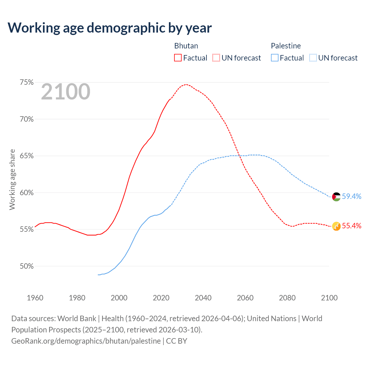 Median age Bhutan vs Palestine, 1960-2100