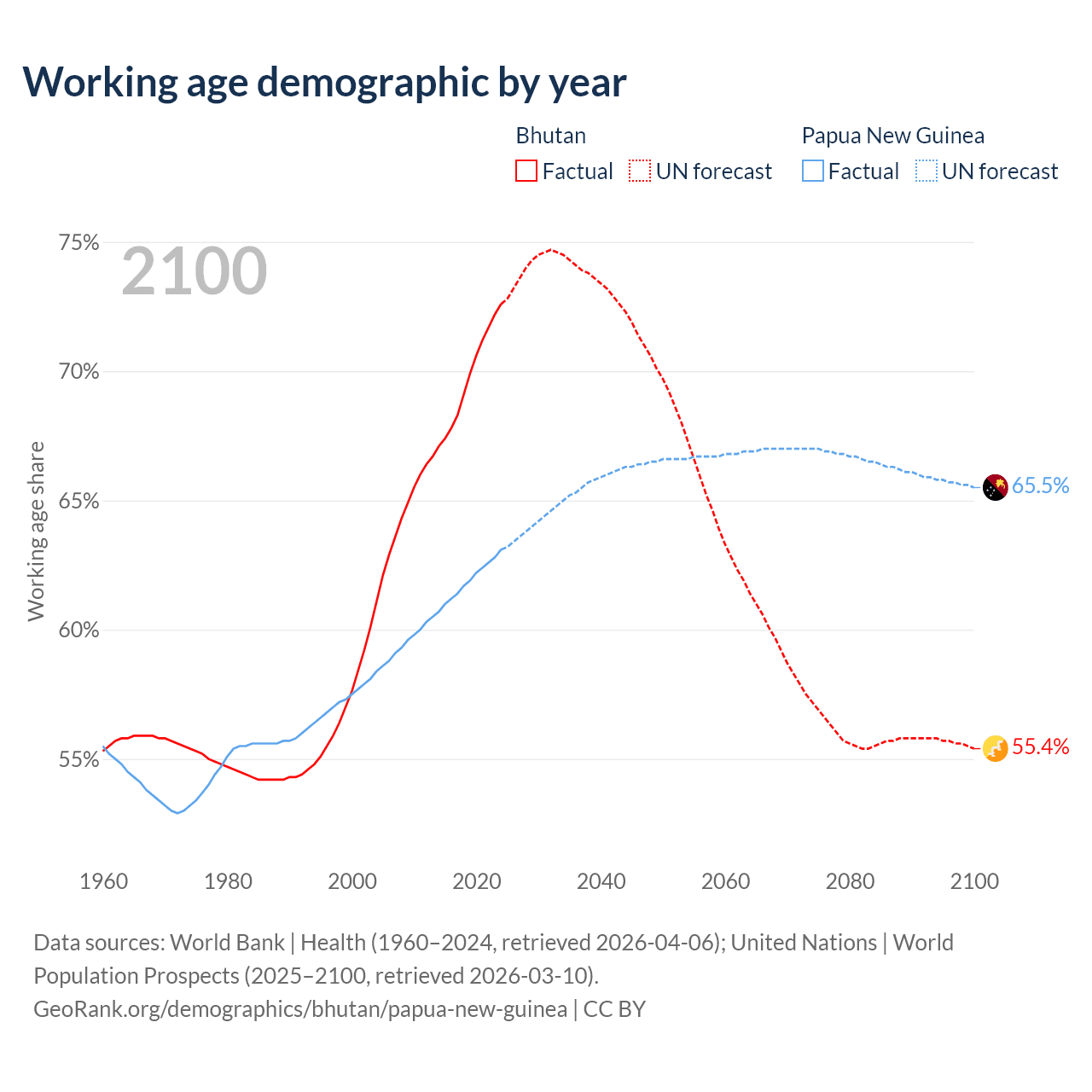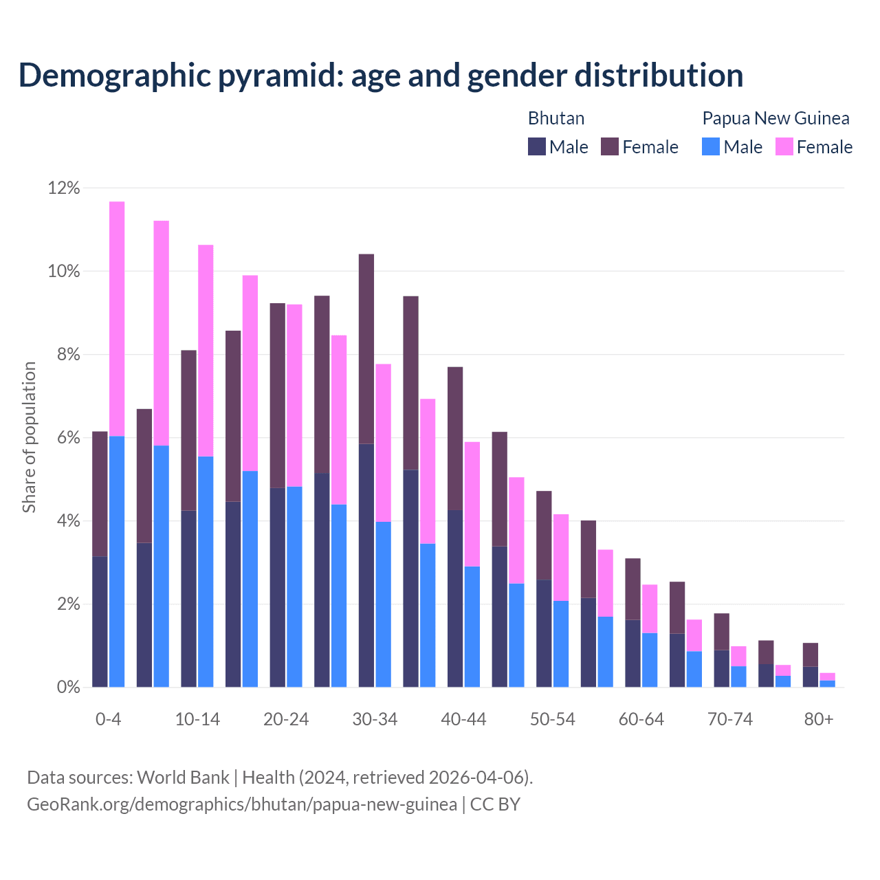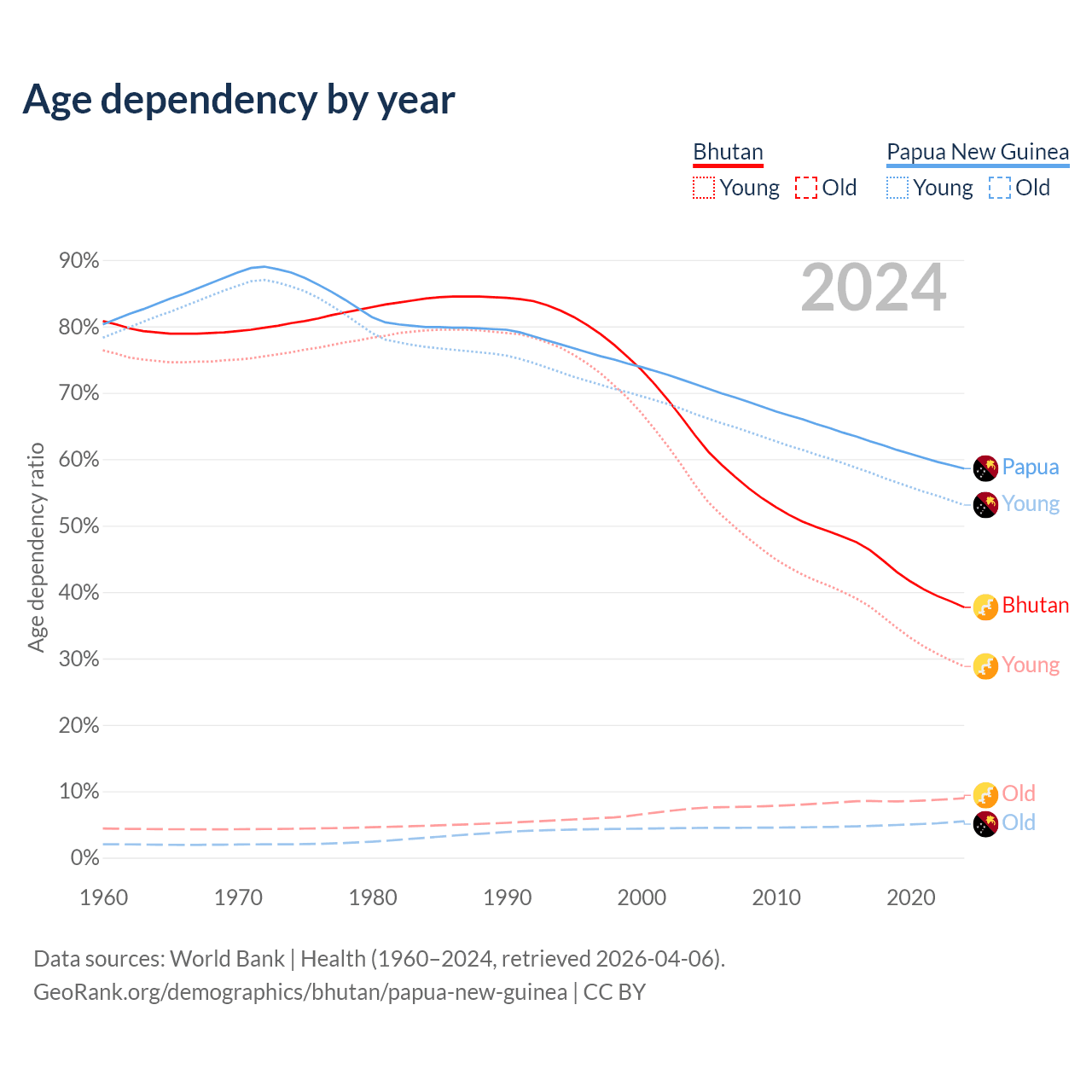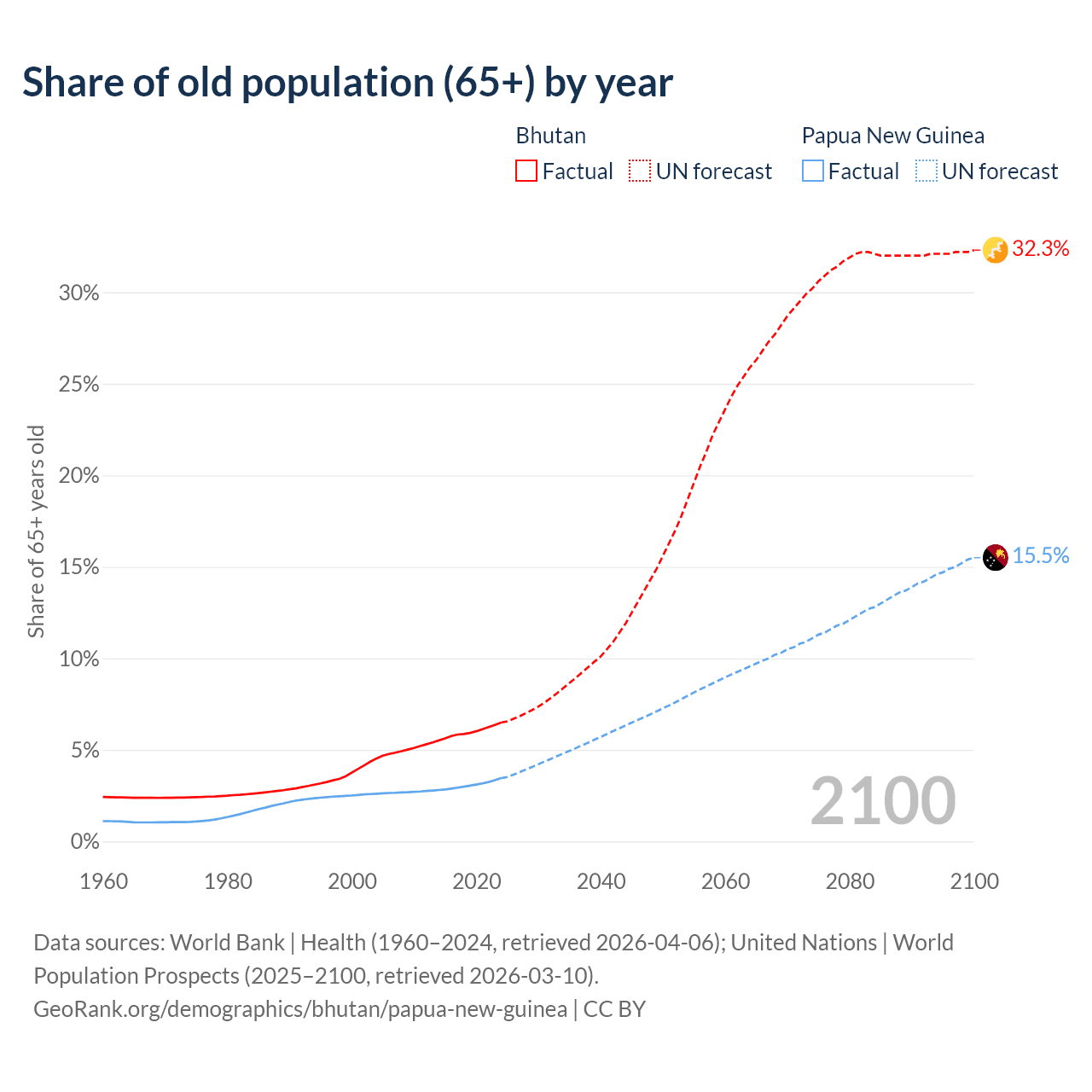 - The share of old-age demographic (65+) in Bhutan is 6.49% vs 3.46% in Papua New Guinea.