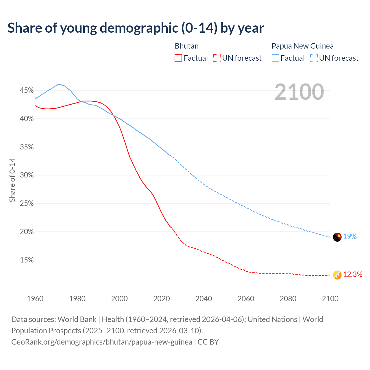 - The share of young demographic (0-15 years old) in Bhutan is 20.9% vs 33.5% in Papua New Guinea.