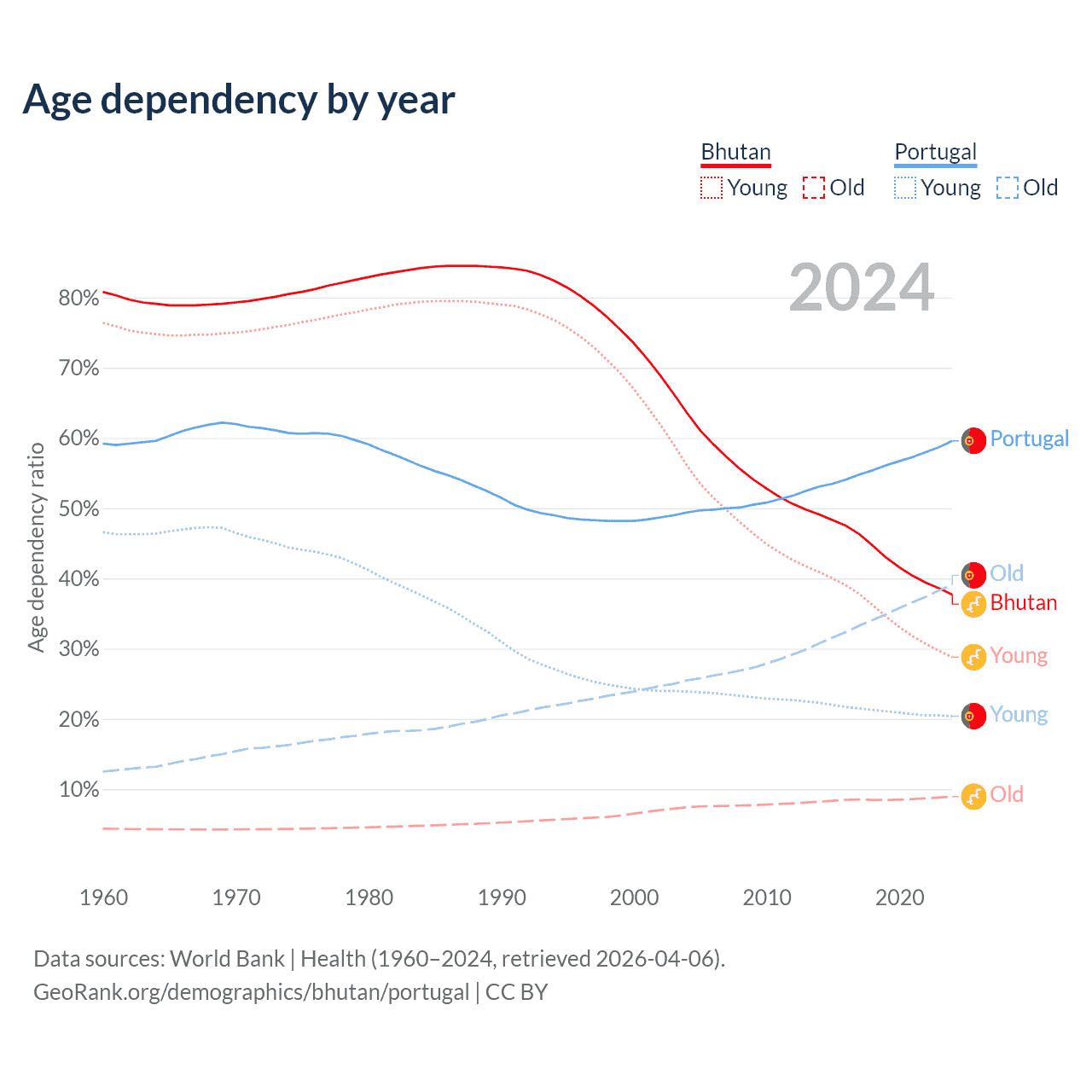 - The share of old-age demographic (65+) in Bhutan is 6.49% vs 24.5% in Portugal.