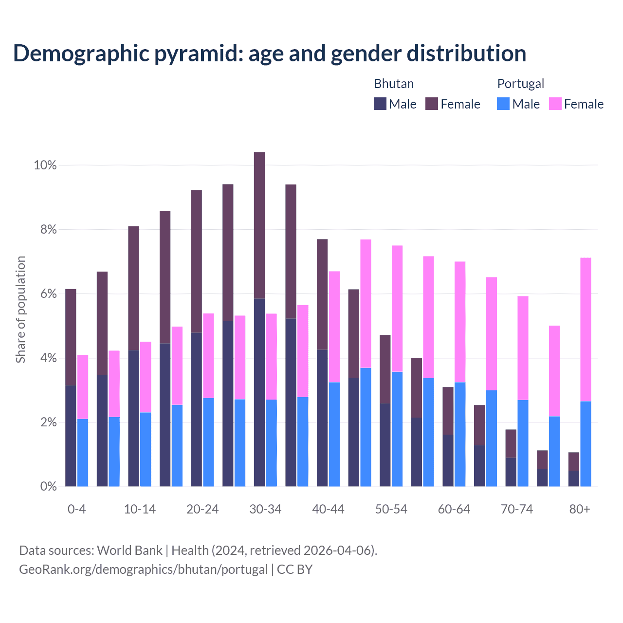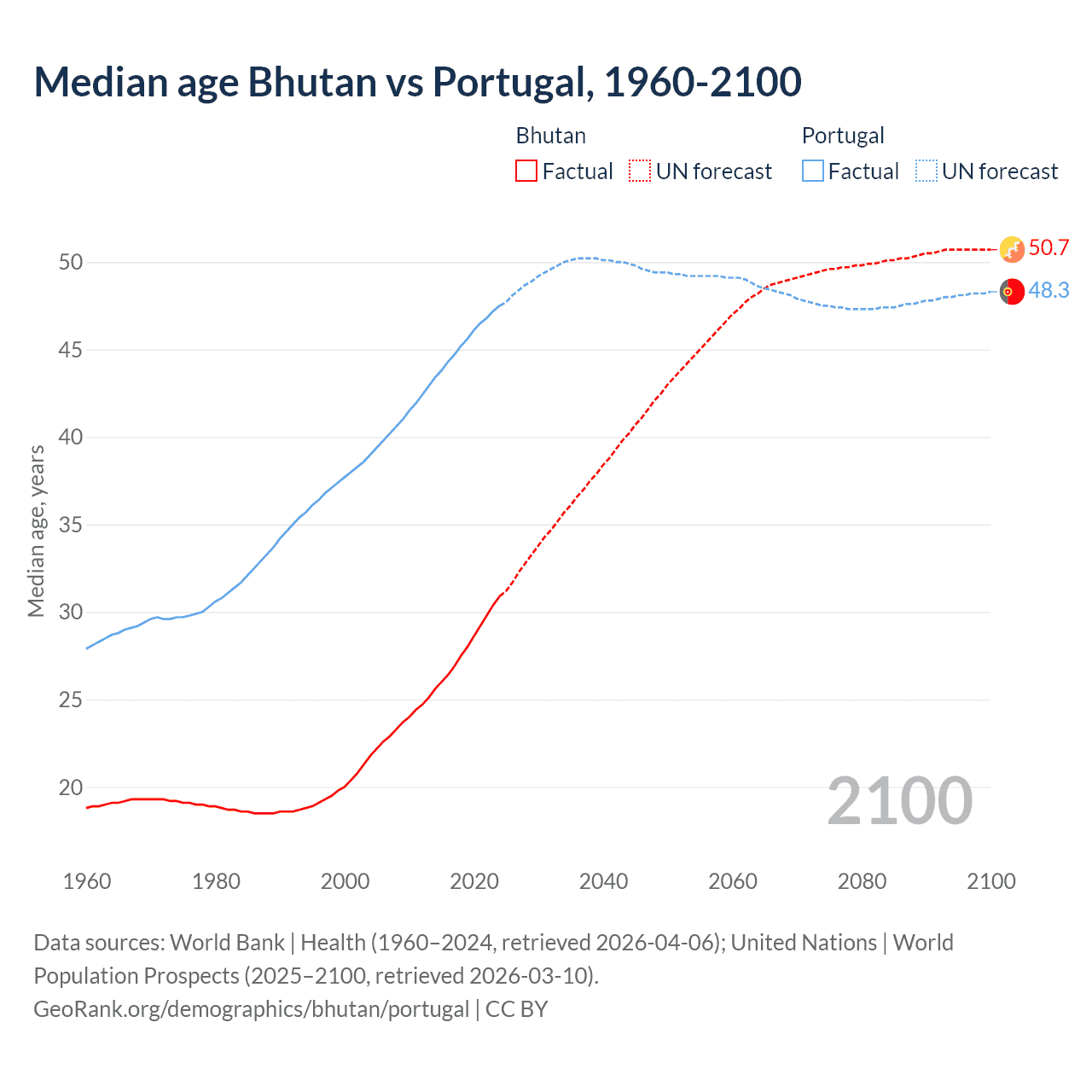 - Bhutan is ranked 95/196 by median age (oldest to youngest) vs 5/196 for Portugal.