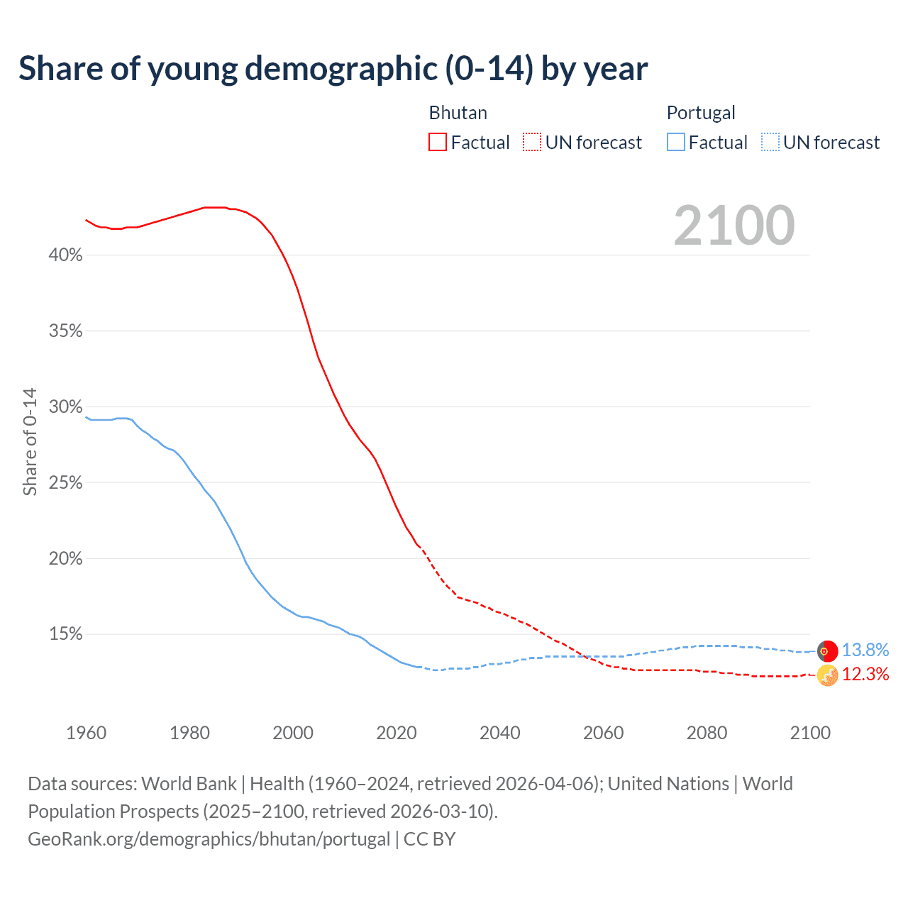 - The share of young demographic (0-15 years old) in Bhutan is 20.9% vs 12.8% in Portugal.