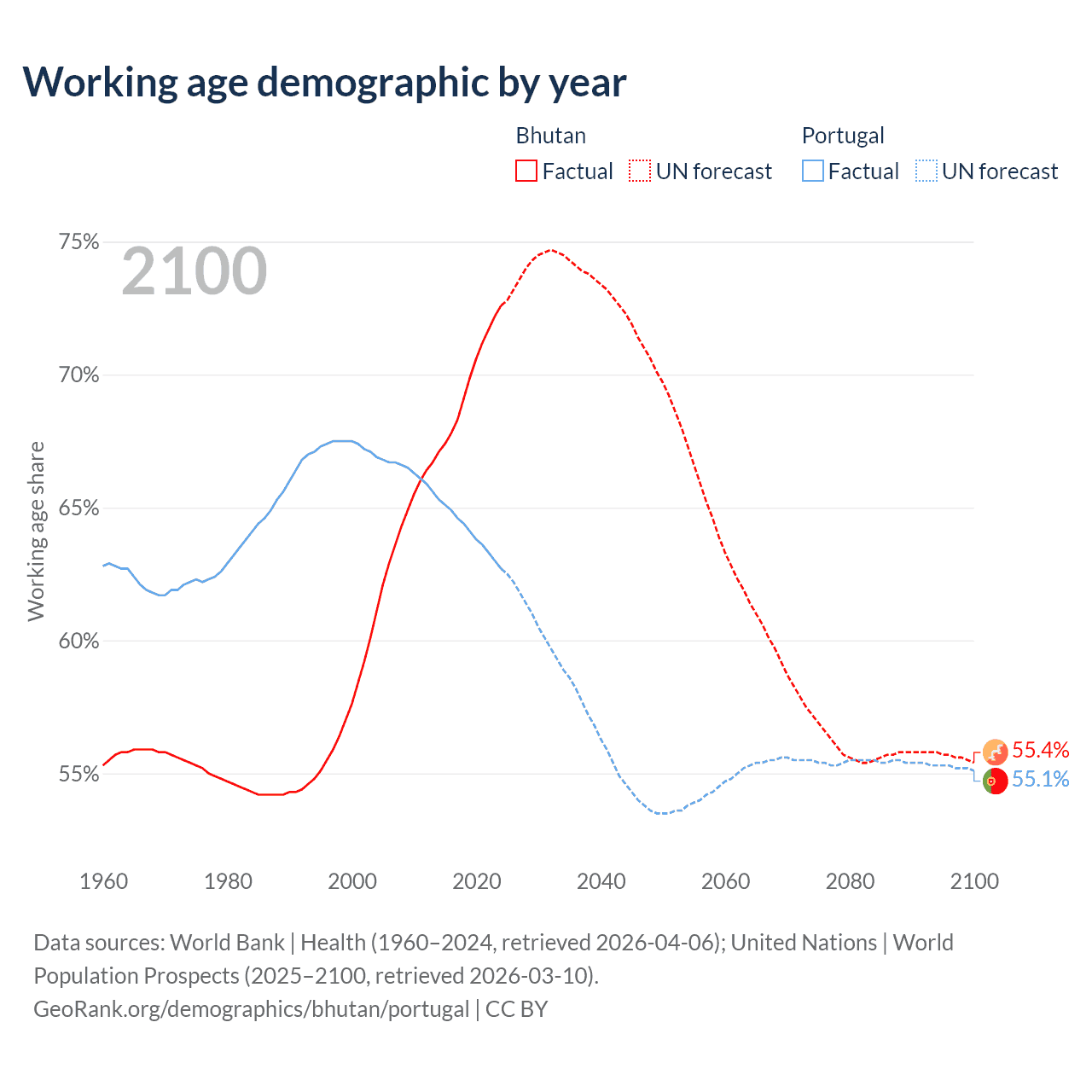- Bhutan has 583K working age adults (aged 15-64) vs 6.68M in Portugal.