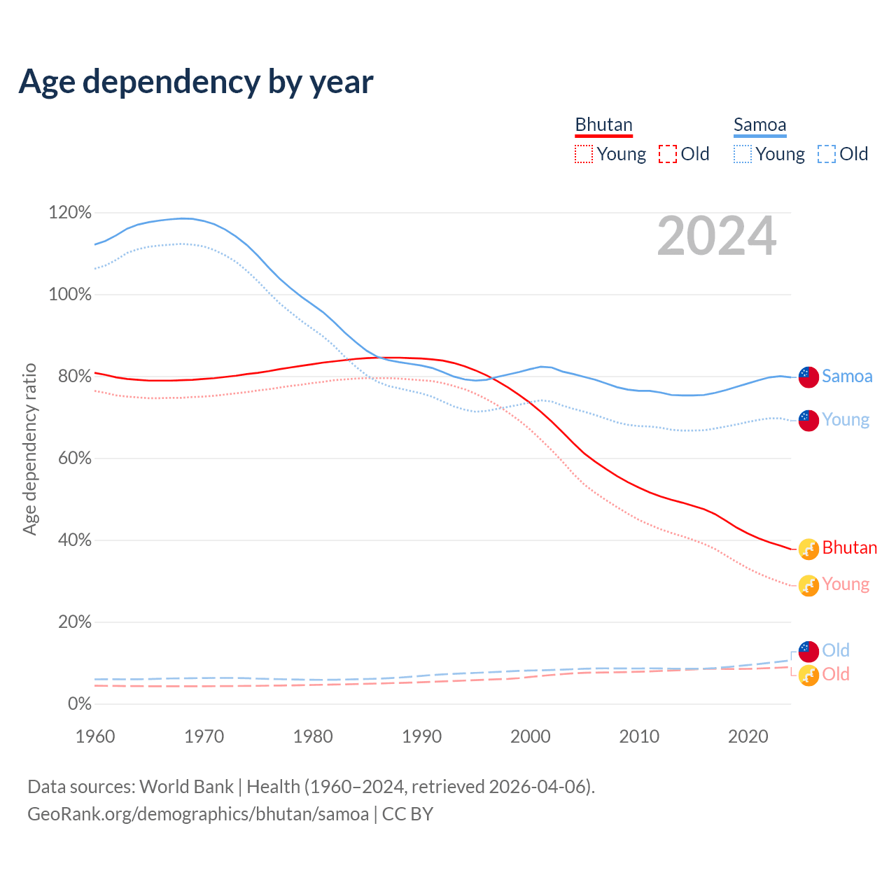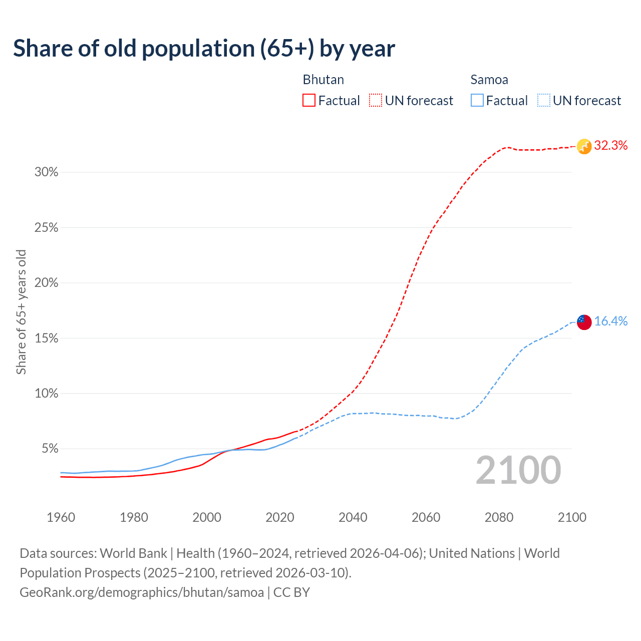 - The share of old-age demographic (65+) in Bhutan is 6.49% vs 5.88% in Samoa.