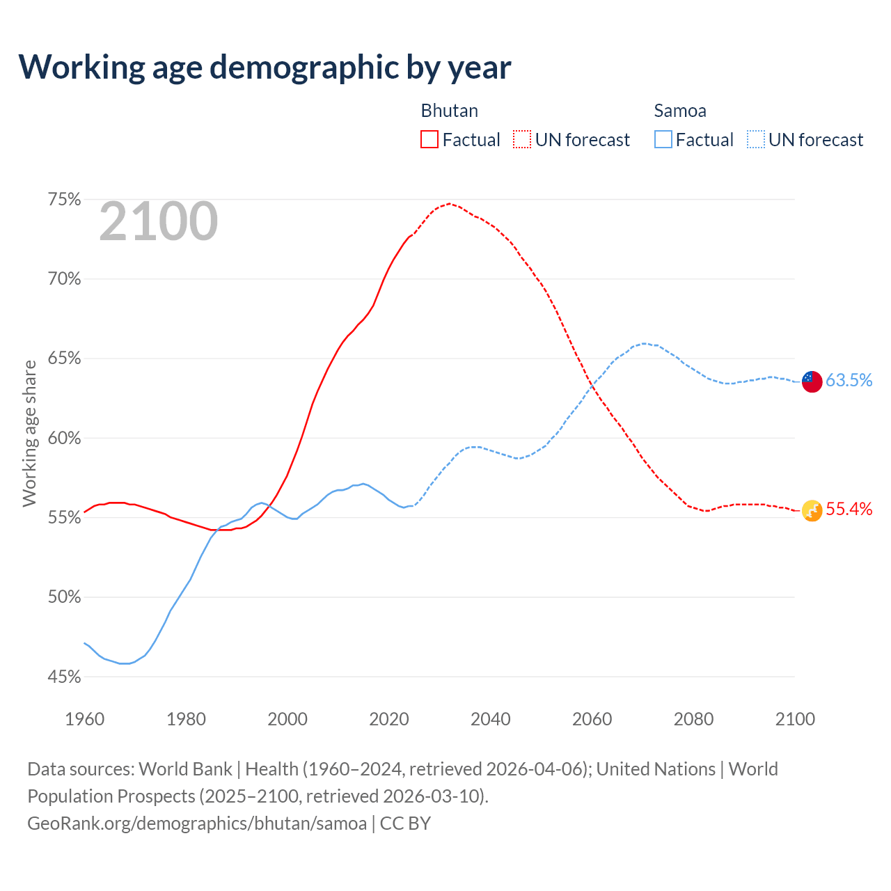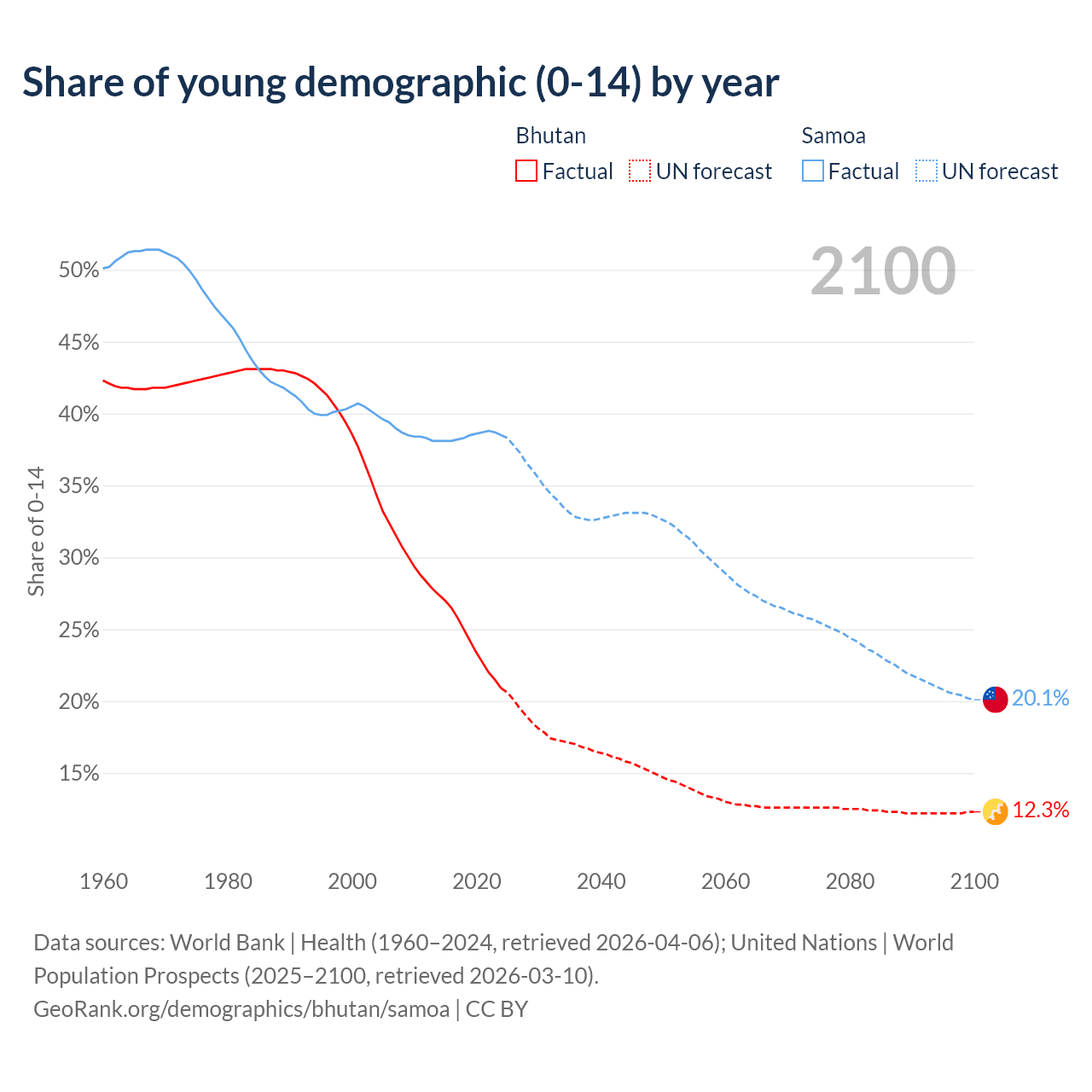 Median age Bhutan vs Samoa, 1960-2100
