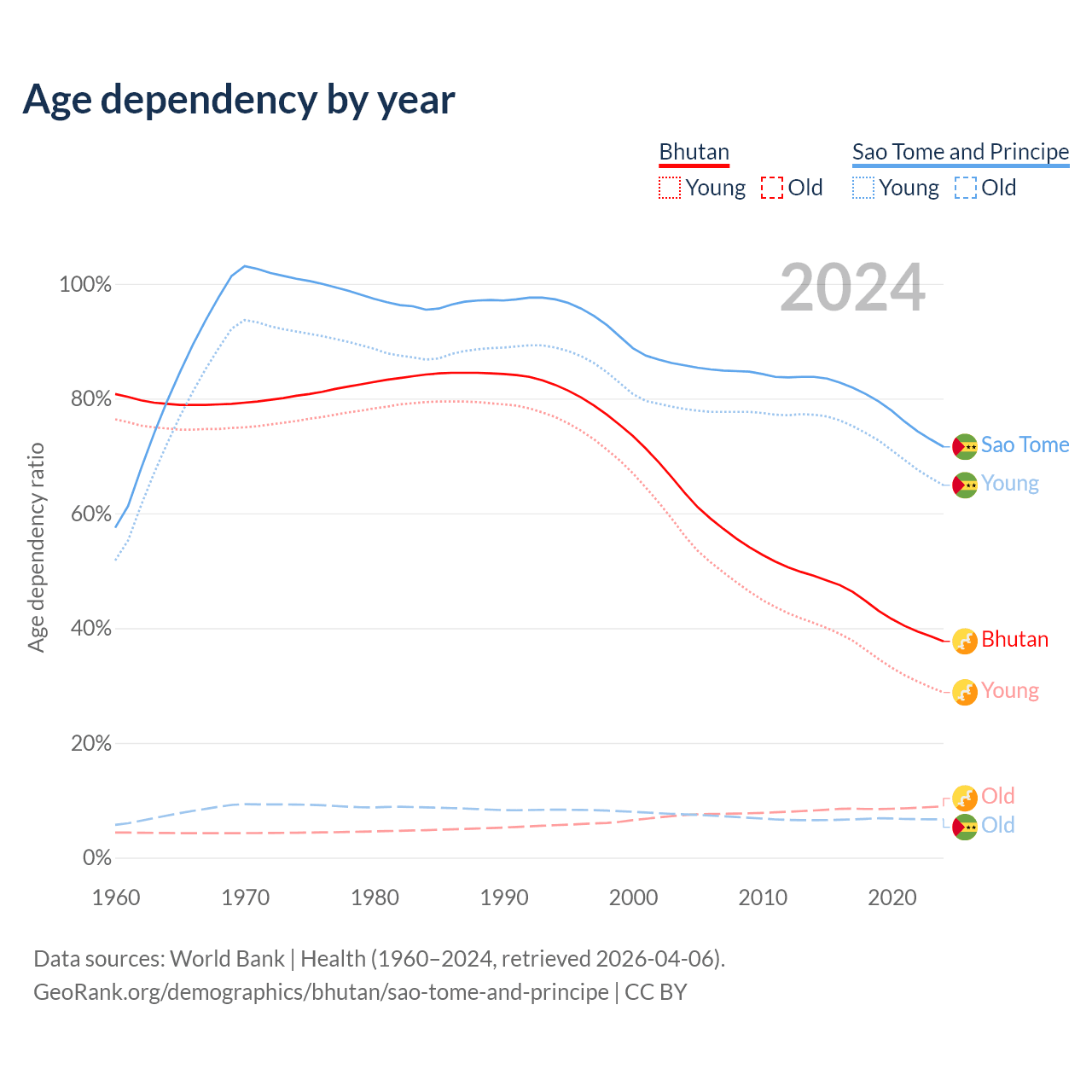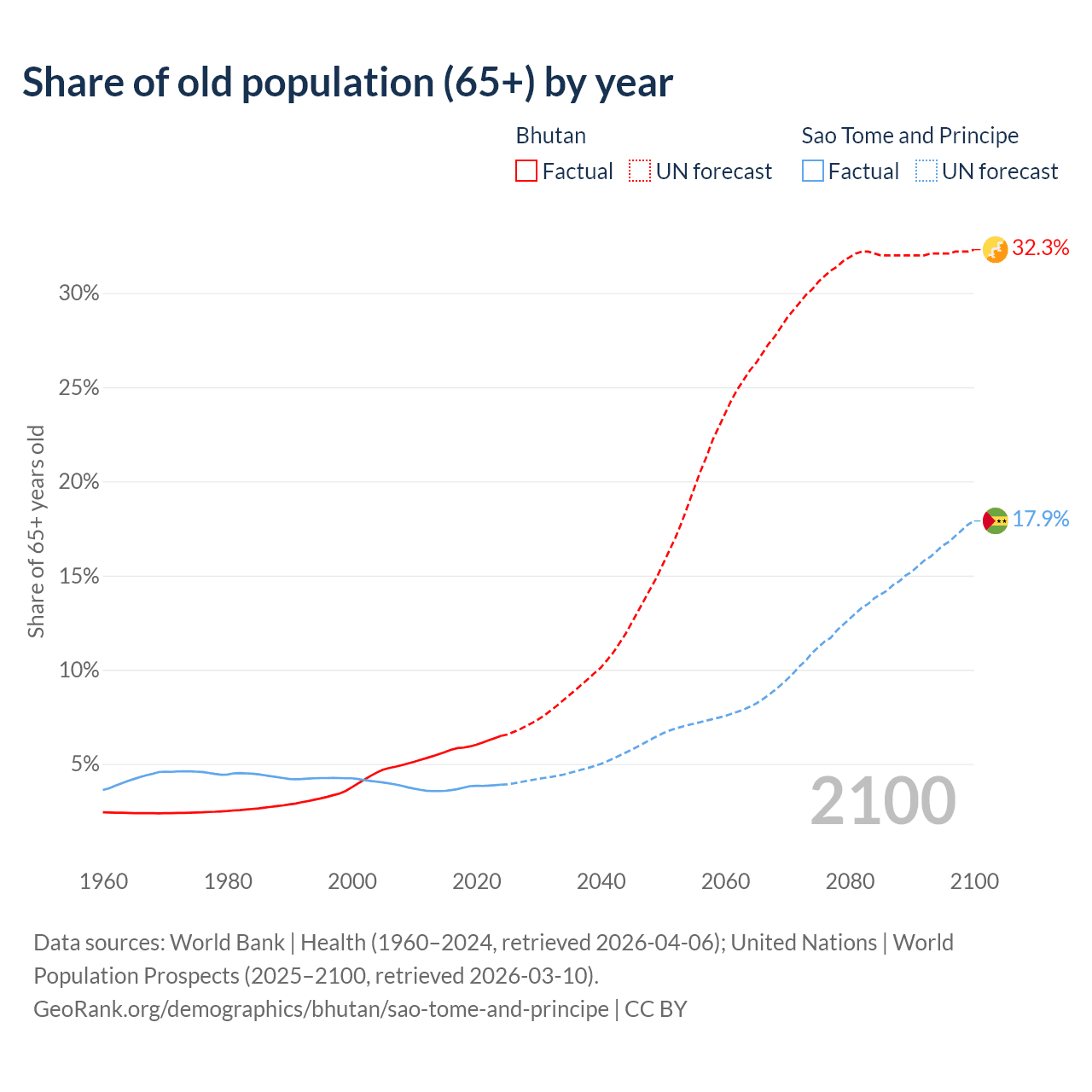 - The share of old-age demographic (65+) in Bhutan is 6.49% vs 3.9% in Sao Tome and Principe.