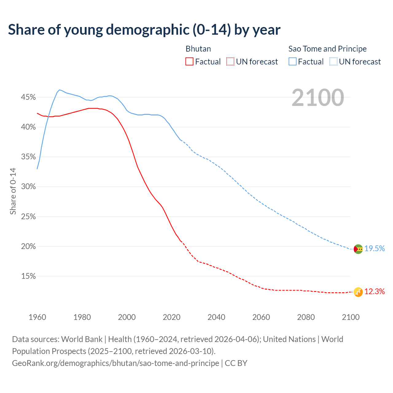 - The share of young demographic (0-15 years old) in Bhutan is 20.9% vs 37.8% in Sao Tome and Principe.
