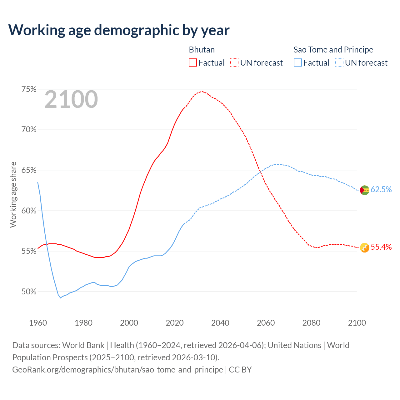 - Bhutan has 583K working age adults (aged 15-64) vs 144K in Sao Tome and Principe.