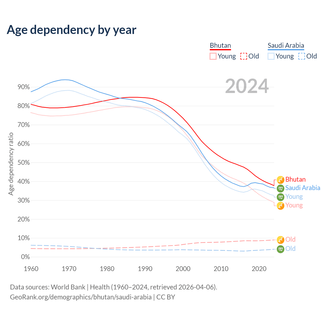- Bhutan is ranked 95/196 by median age (oldest to youngest) vs 98/196 for Saudi Arabia.