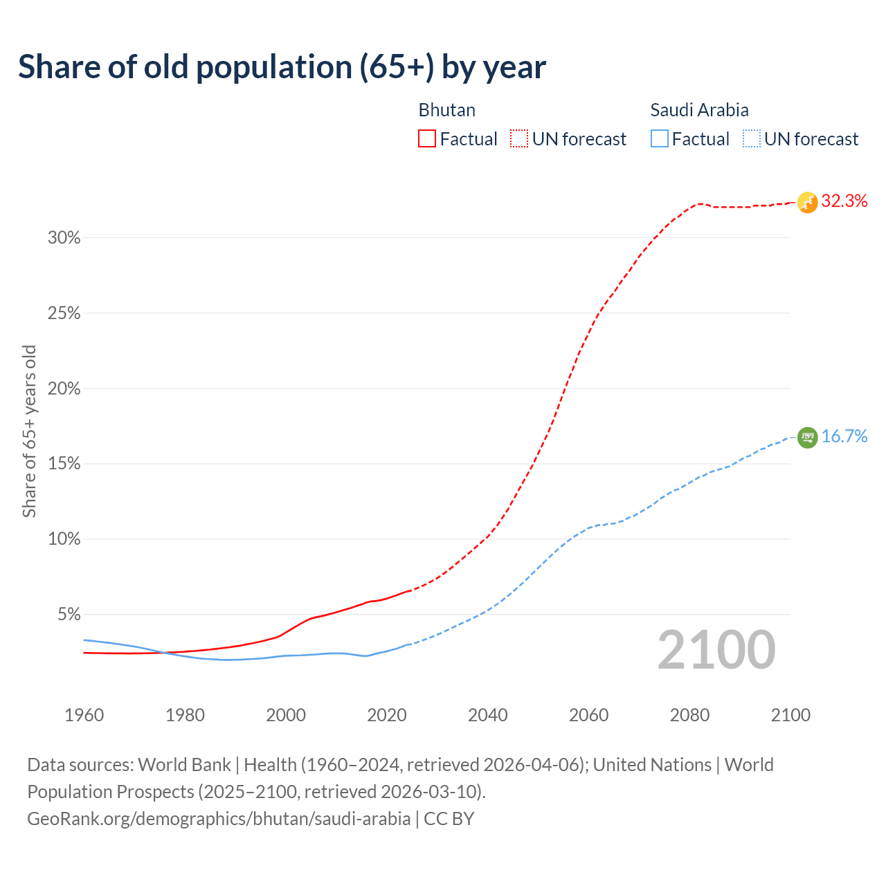 - The share of old-age demographic (65+) in Bhutan is 6.49% vs 2.95% in Saudi Arabia.
