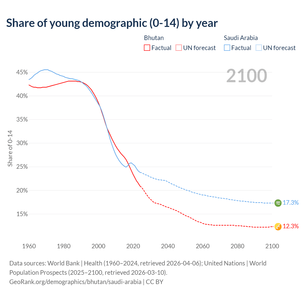- The share of young demographic (0-15 years old) in Bhutan is 20.9% vs 23.8% in Saudi Arabia.