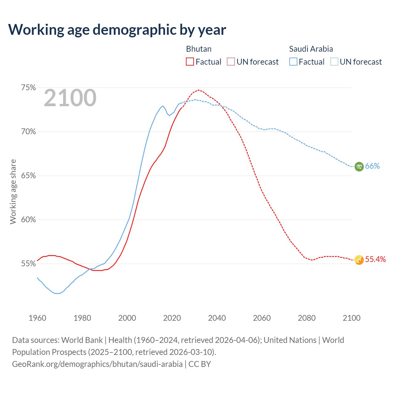 Median age Bhutan vs Saudi Arabia, 1960-2100