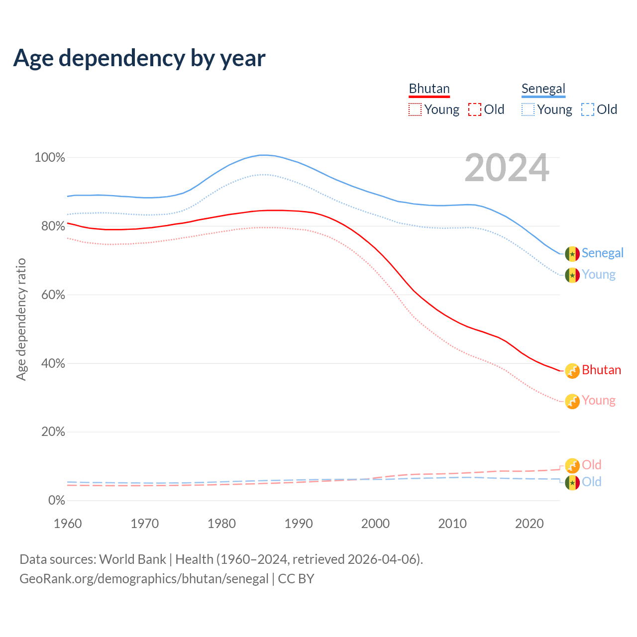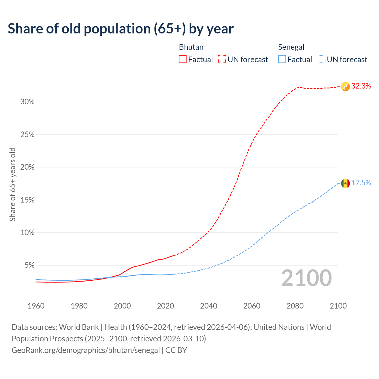 - The share of old-age demographic (65+) in Bhutan is 6.49% vs 3.62% in Senegal.
