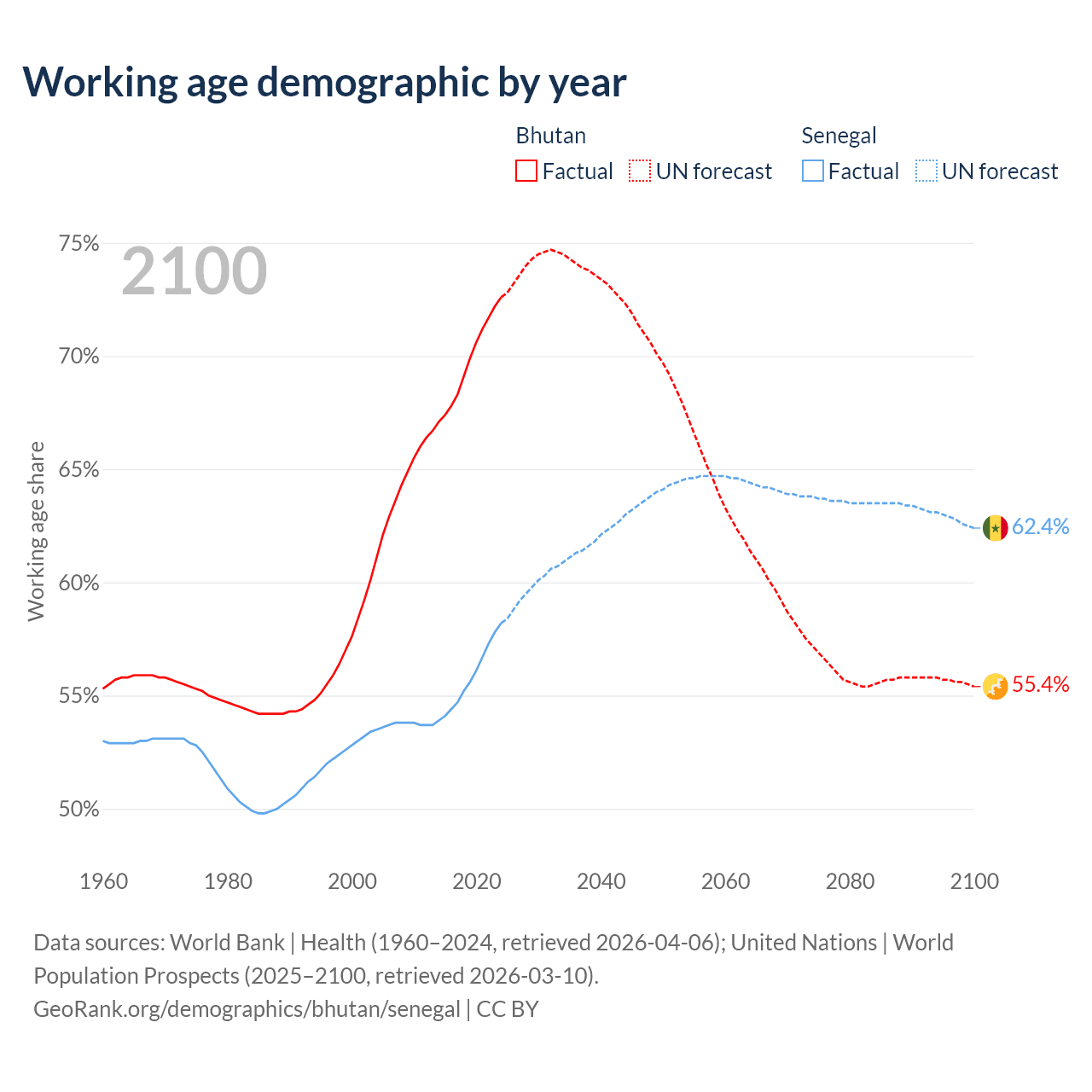Median age Bhutan vs Senegal, 1960-2100