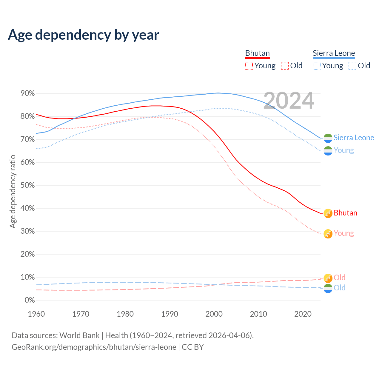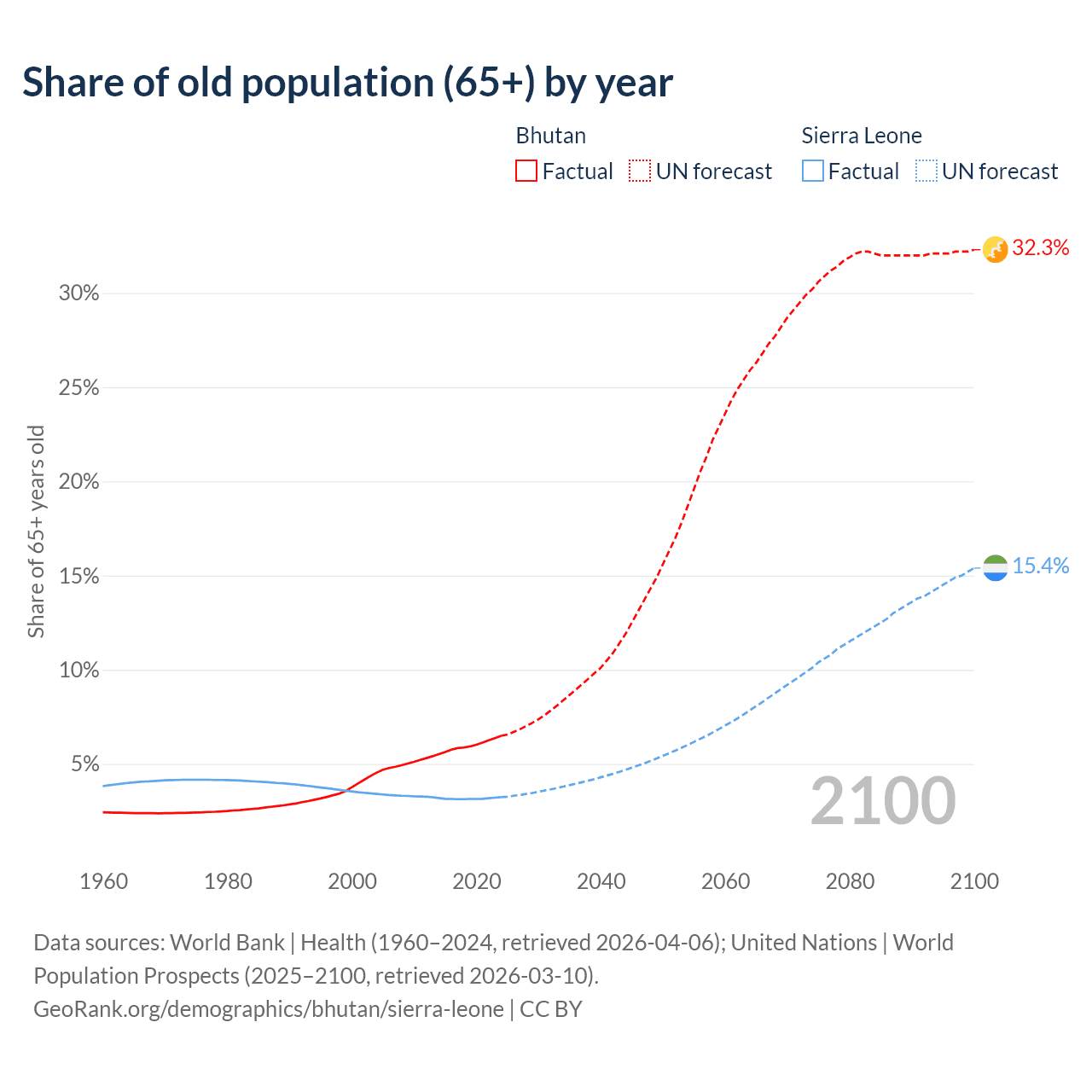 - The share of old-age demographic (65+) in Bhutan is 6.49% vs 3.24% in Sierra Leone.