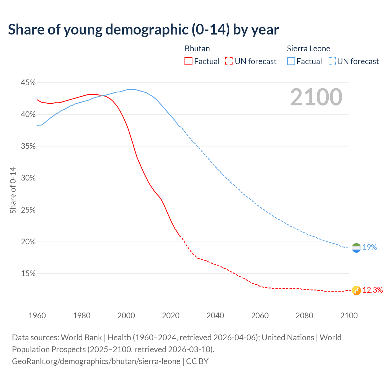 - The share of young demographic (0-15 years old) in Bhutan is 20.9% vs 38.1% in Sierra Leone.