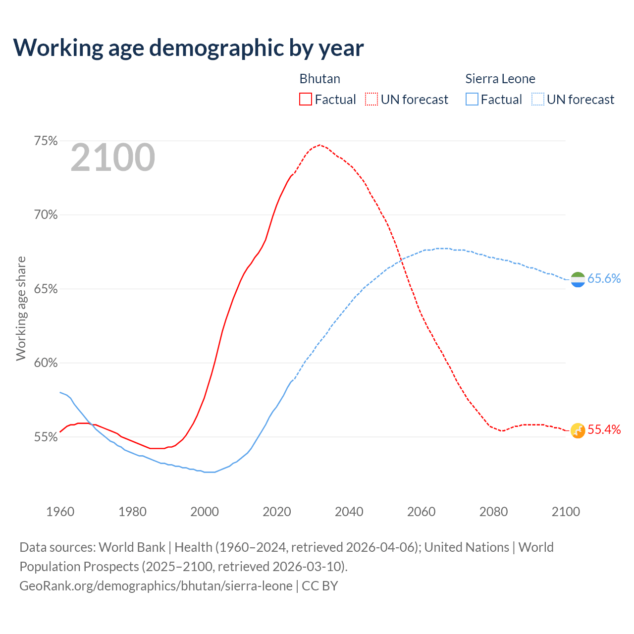 - Bhutan has 583K working age adults (aged 15-64) vs 5.31M in Sierra Leone.