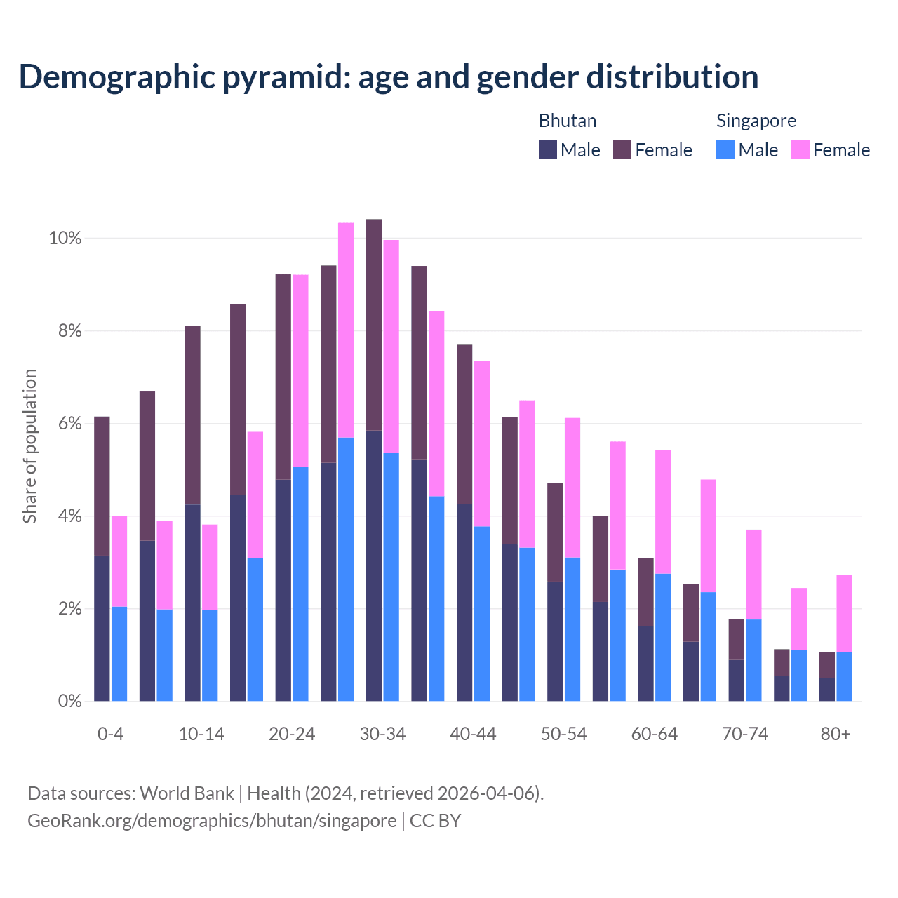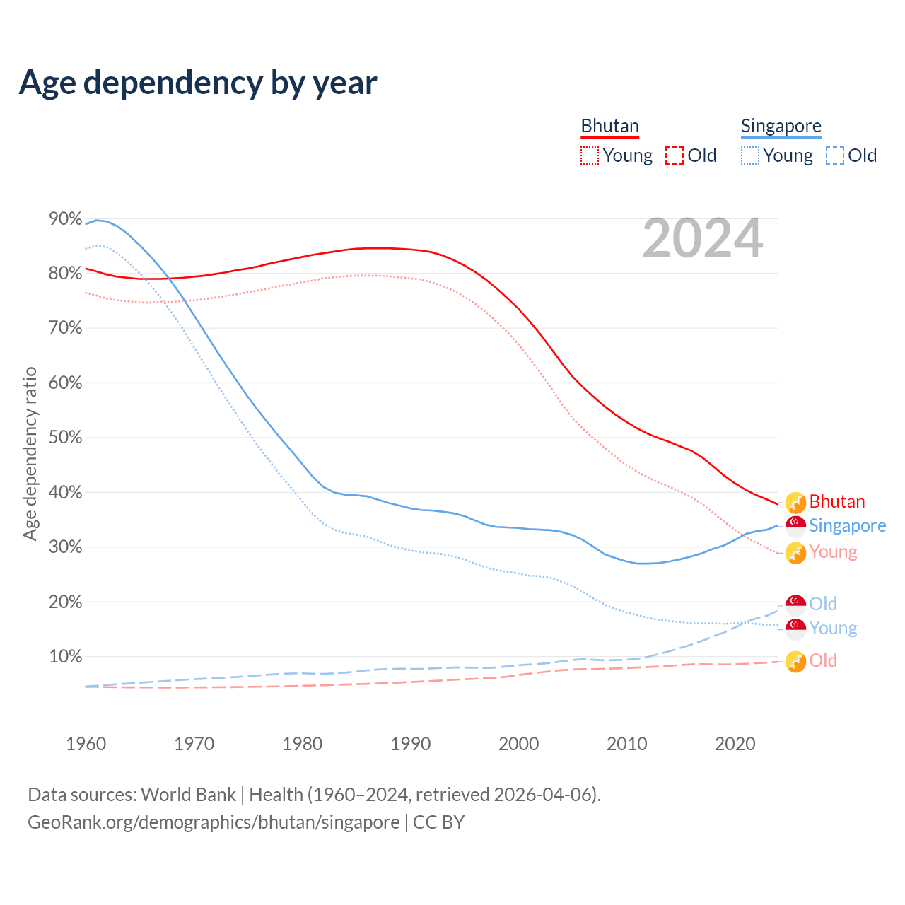 - Bhutan is ranked 95/196 by median age (oldest to youngest) vs 68/196 for Singapore.