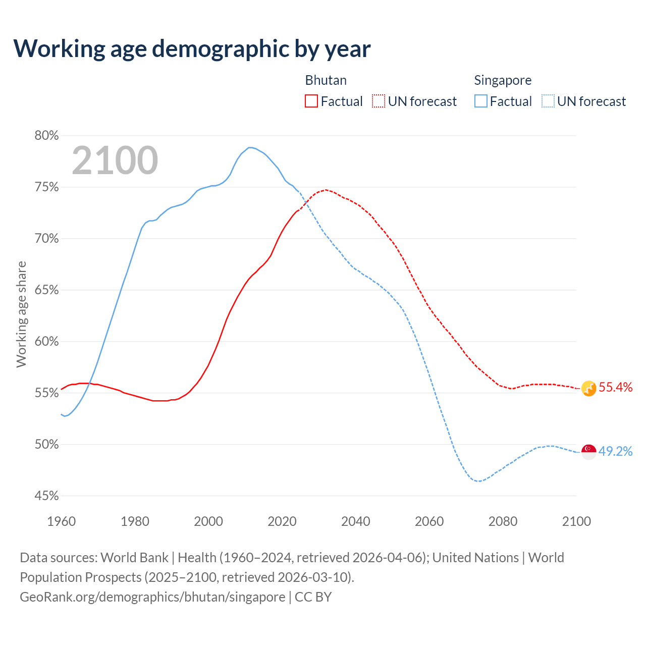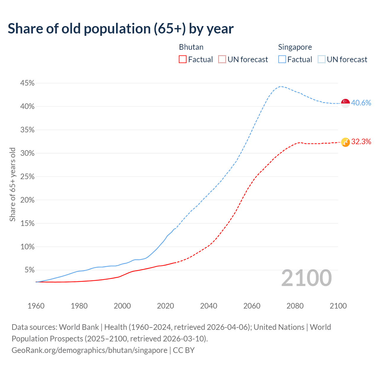 Median age Bhutan vs Singapore, 1960-2100