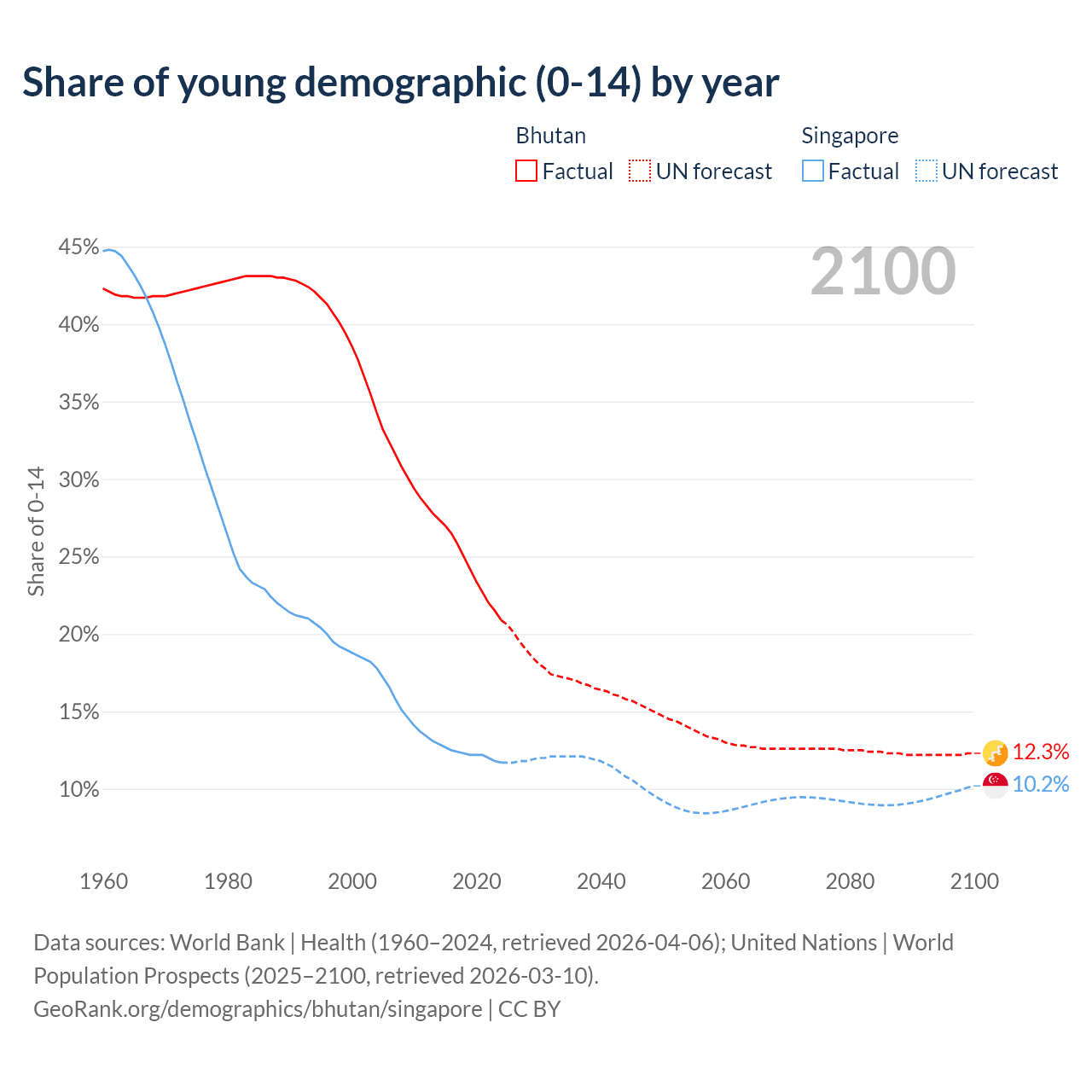 - The share of young demographic (0-15 years old) in Bhutan is 20.9% vs 11.7% in Singapore.