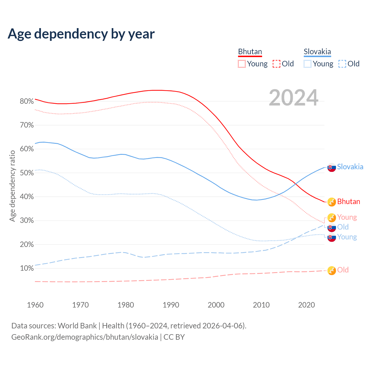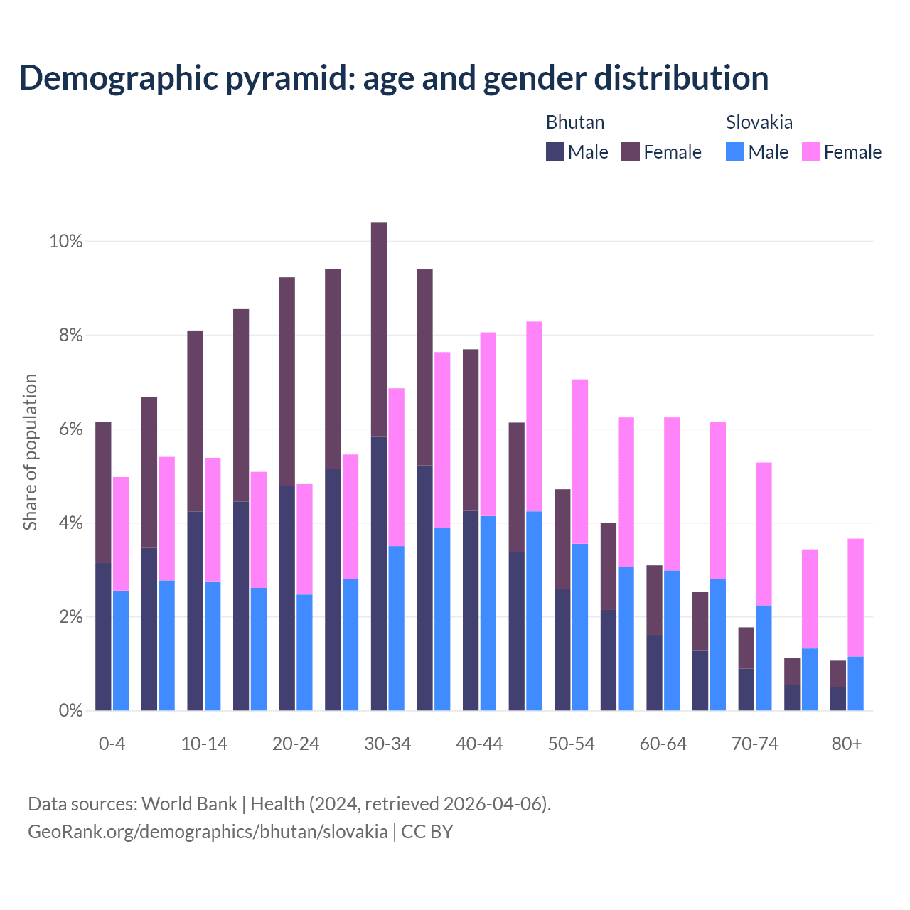 - The share of old-age demographic (65+) in Bhutan is 6.49% vs 18.5% in Slovakia.