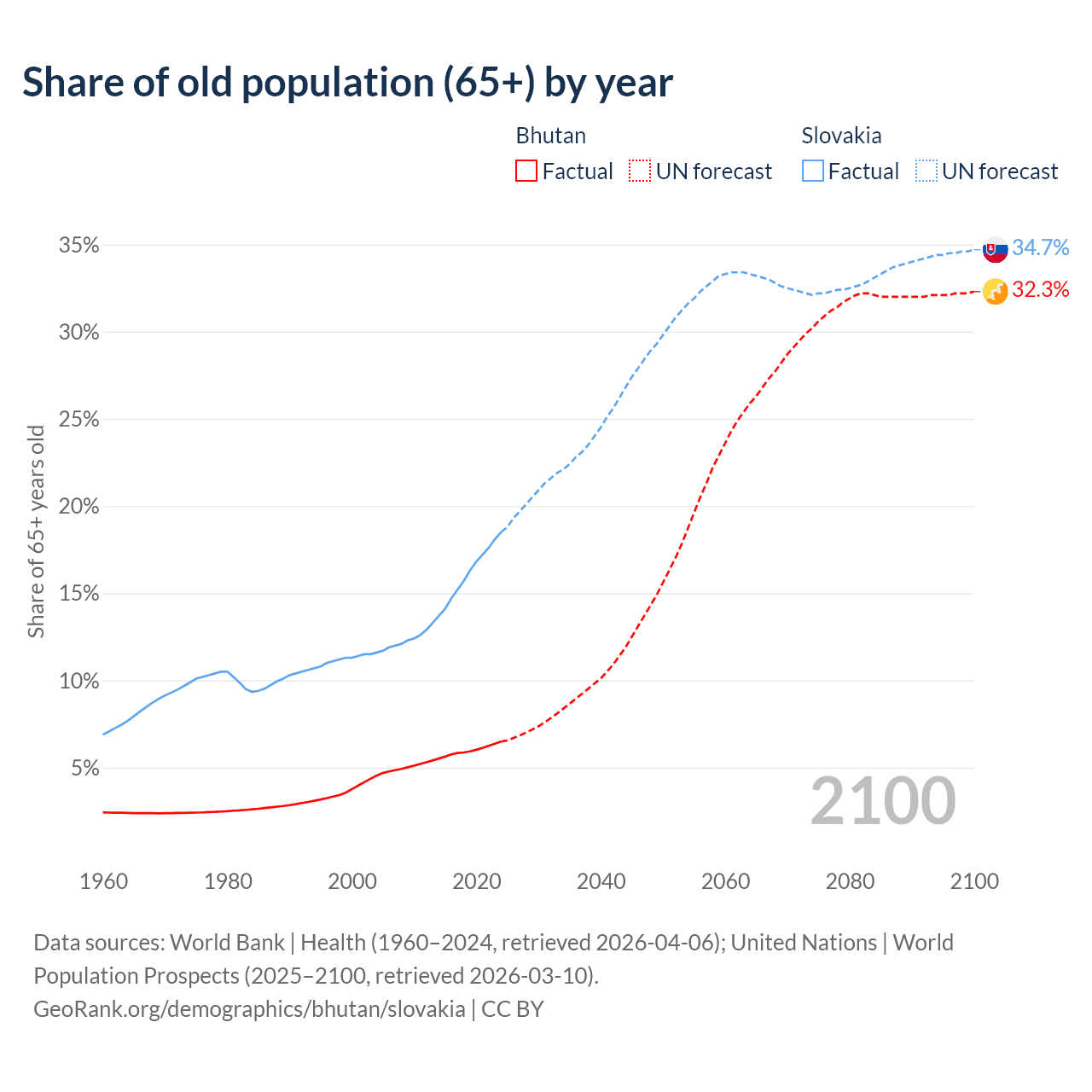 The share of older people aged 65 and over is 6.49% in Bhutan and 18.5% in Slovakia. Life expectancy in Bhutan compared to Slovakia .