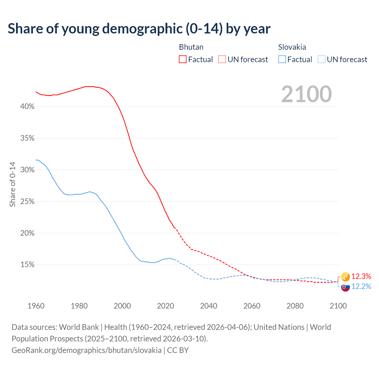 - The share of young demographic (0-15 years old) in Bhutan is 20.9% vs 15.8% in Slovakia.