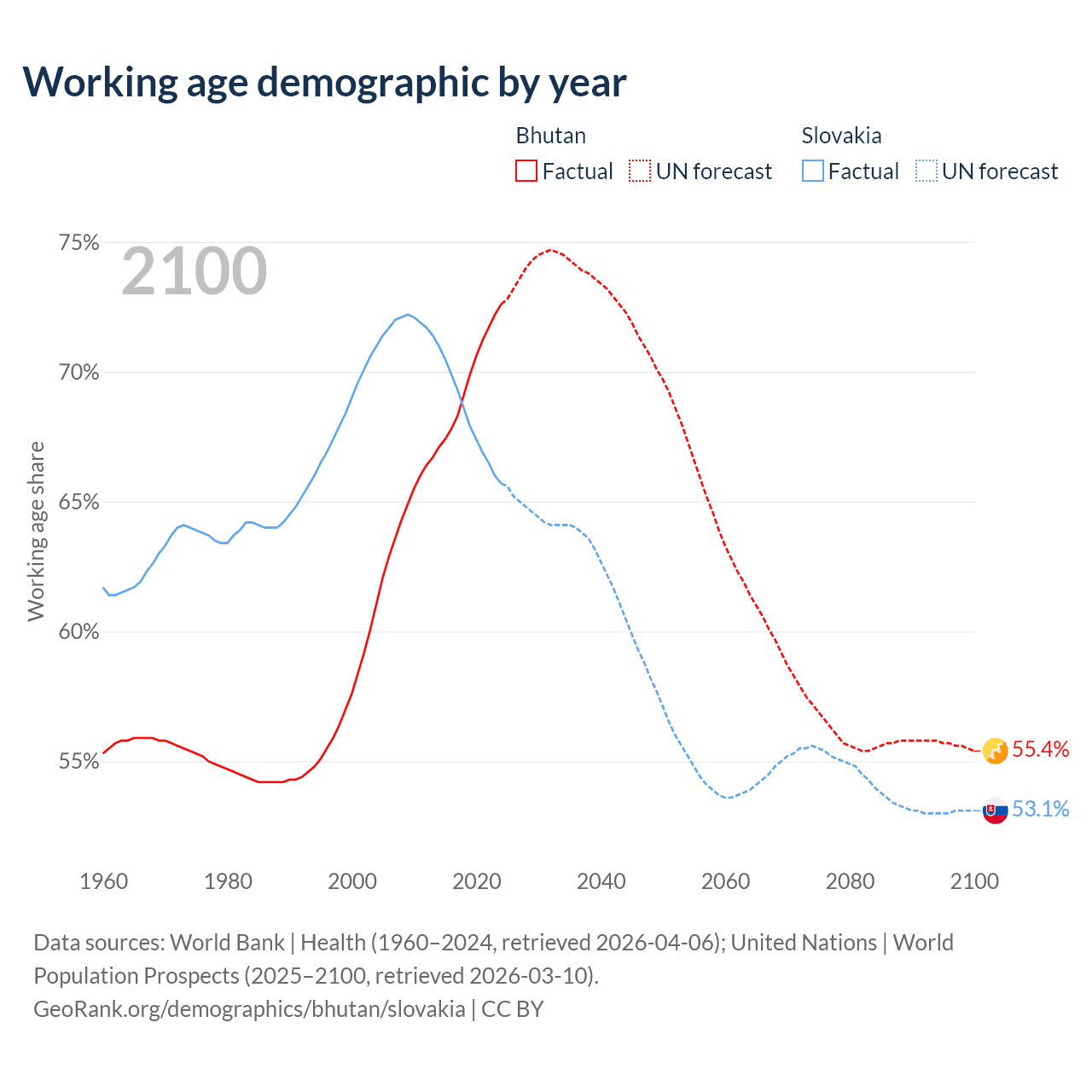 Median age Bhutan vs Slovakia, 1960-2100