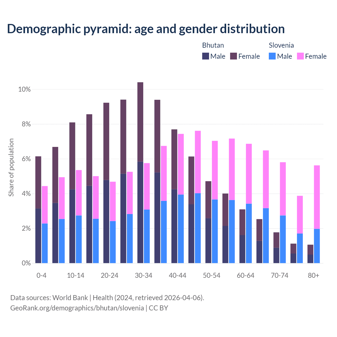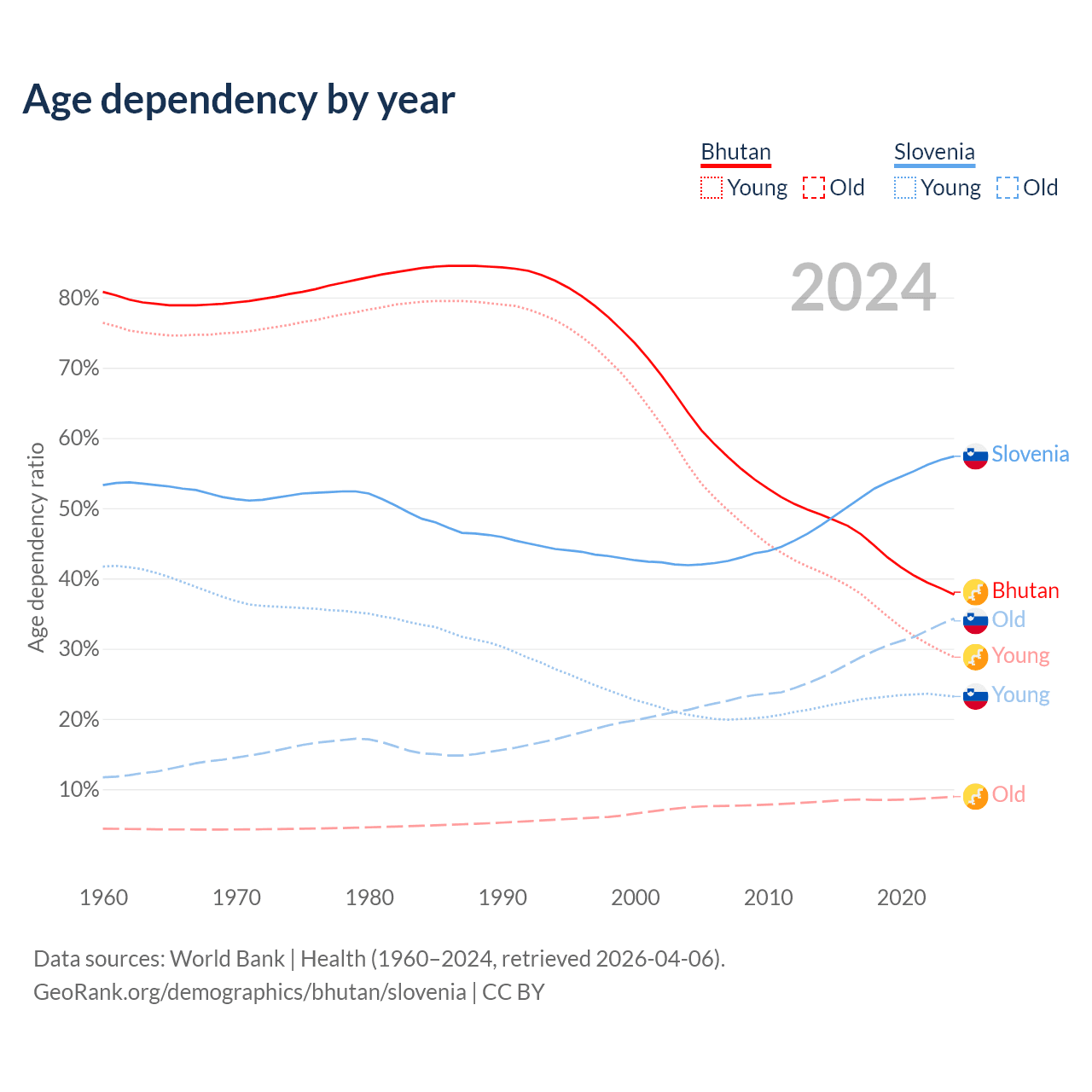 - Bhutan is ranked 95/196 by median age (oldest to youngest) vs 14/196 for Slovenia.