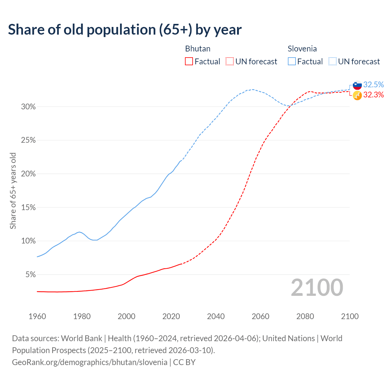 The share of older people aged 65 and over is 6.49% in Bhutan and 21.8% in Slovenia. Life expectancy in Bhutan compared to Slovenia .